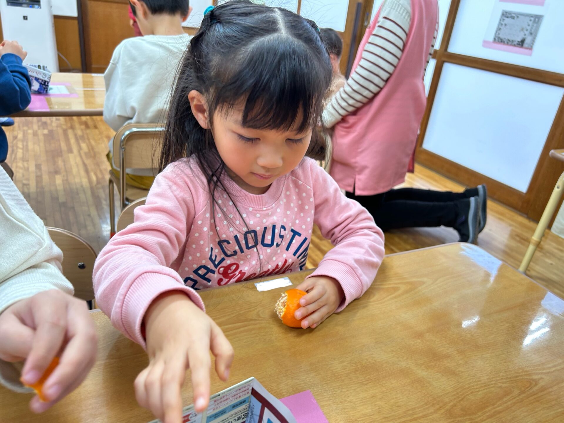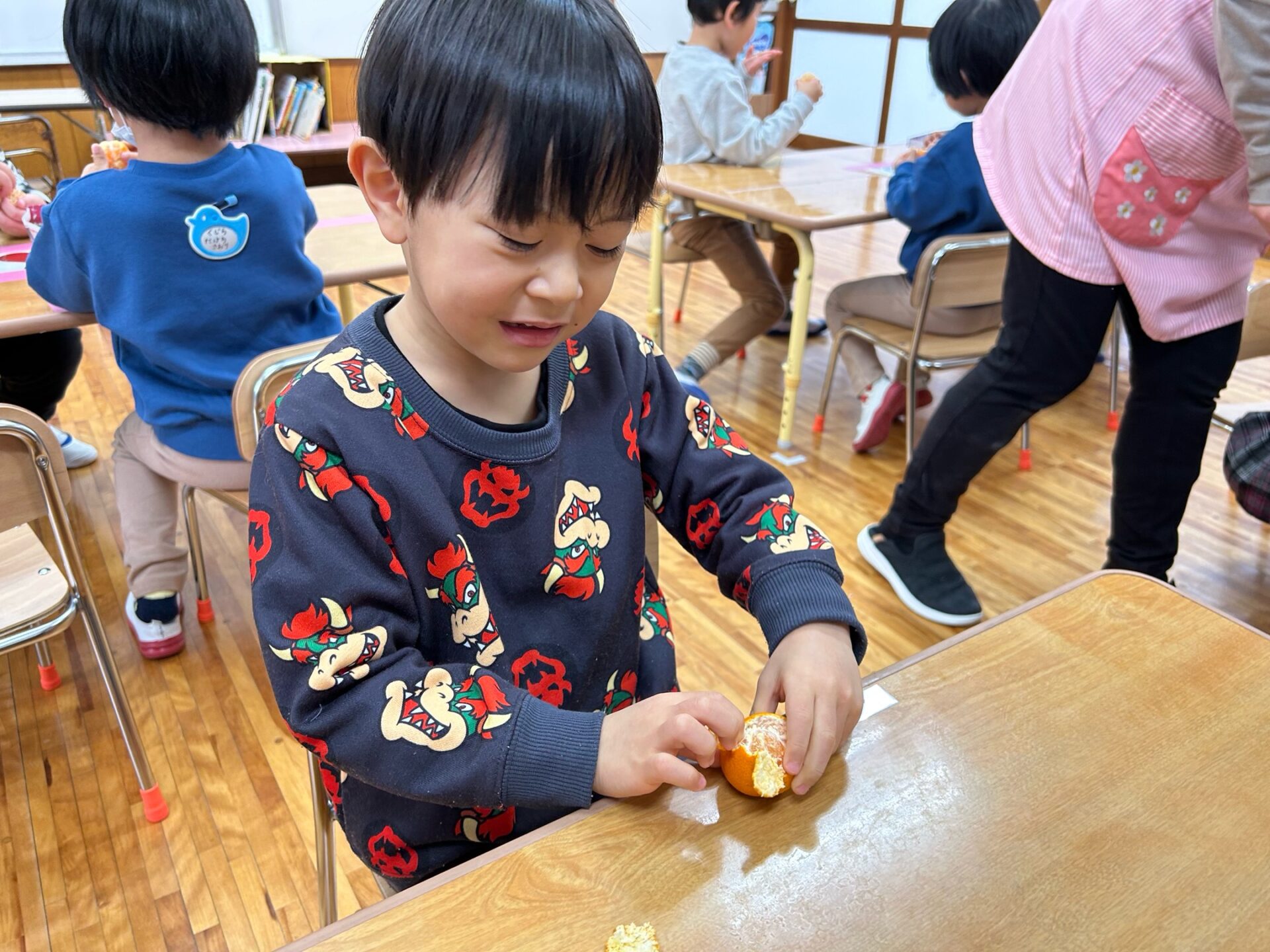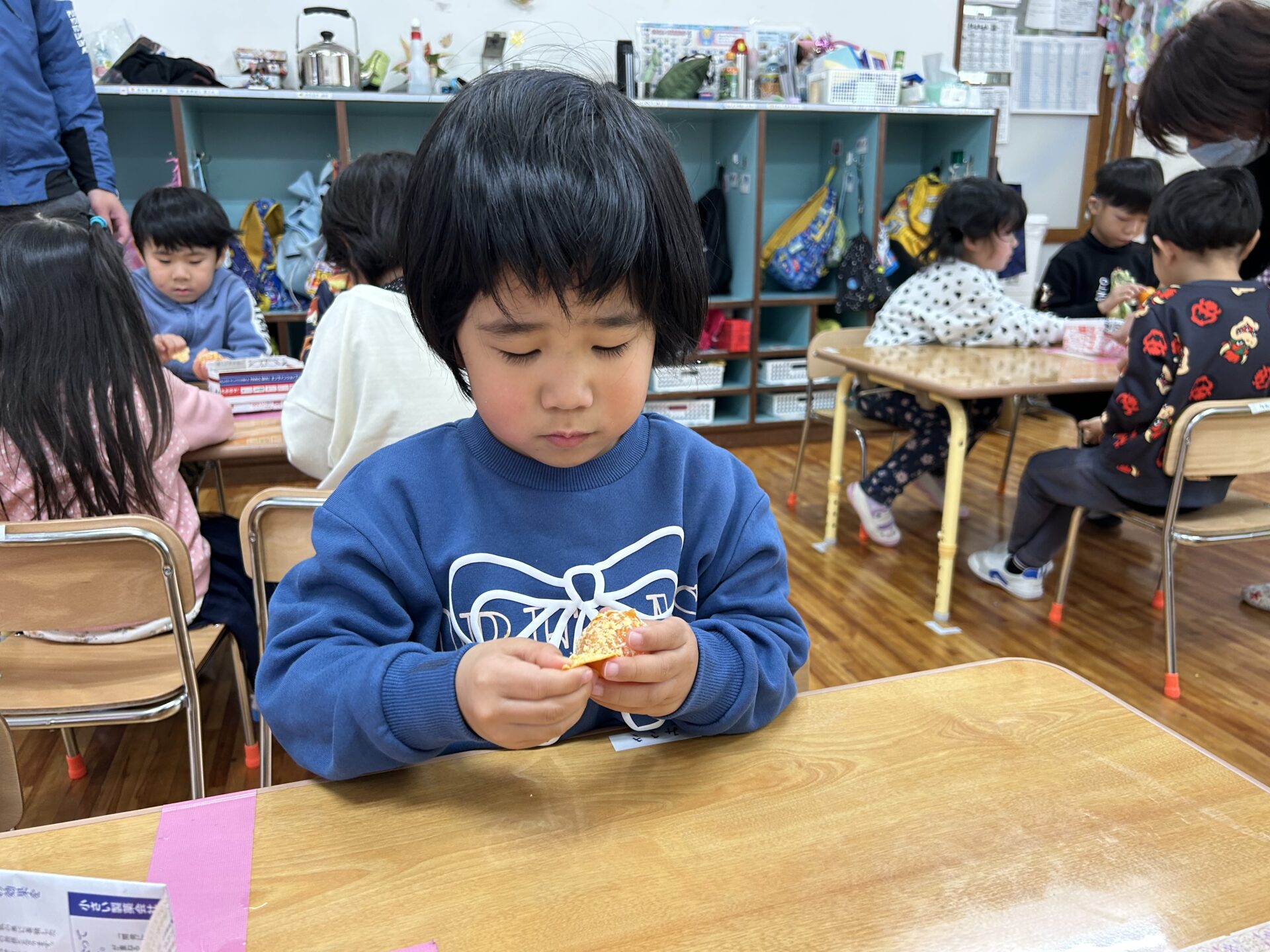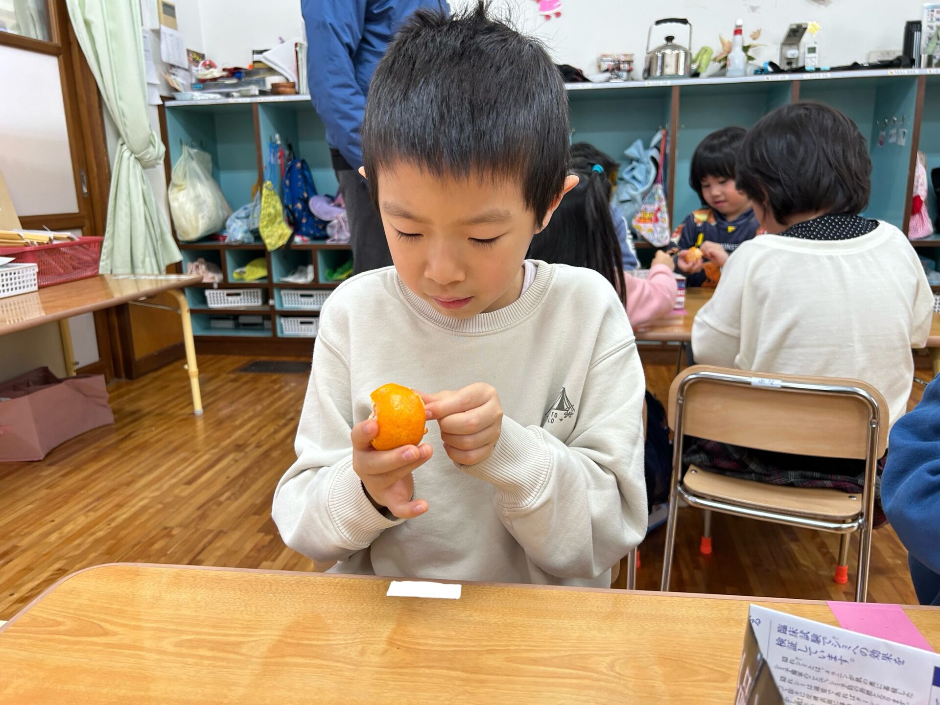 薄いみかんの皮を、真剣な表情で丁寧にむいていましたよ。果肉を見て、「ゼリーみたい」「つぶつぶ」と思いがけないプレゼントがうれしくてはしゃいでいる姿が印象的でした。そして、「いただきまーす」食べる時、みんなニコニコ顔でした。