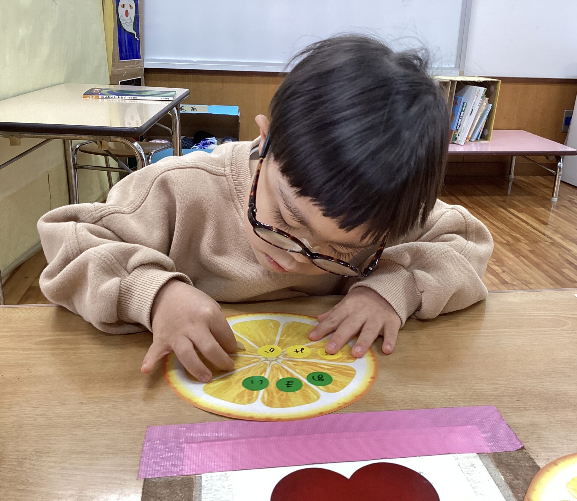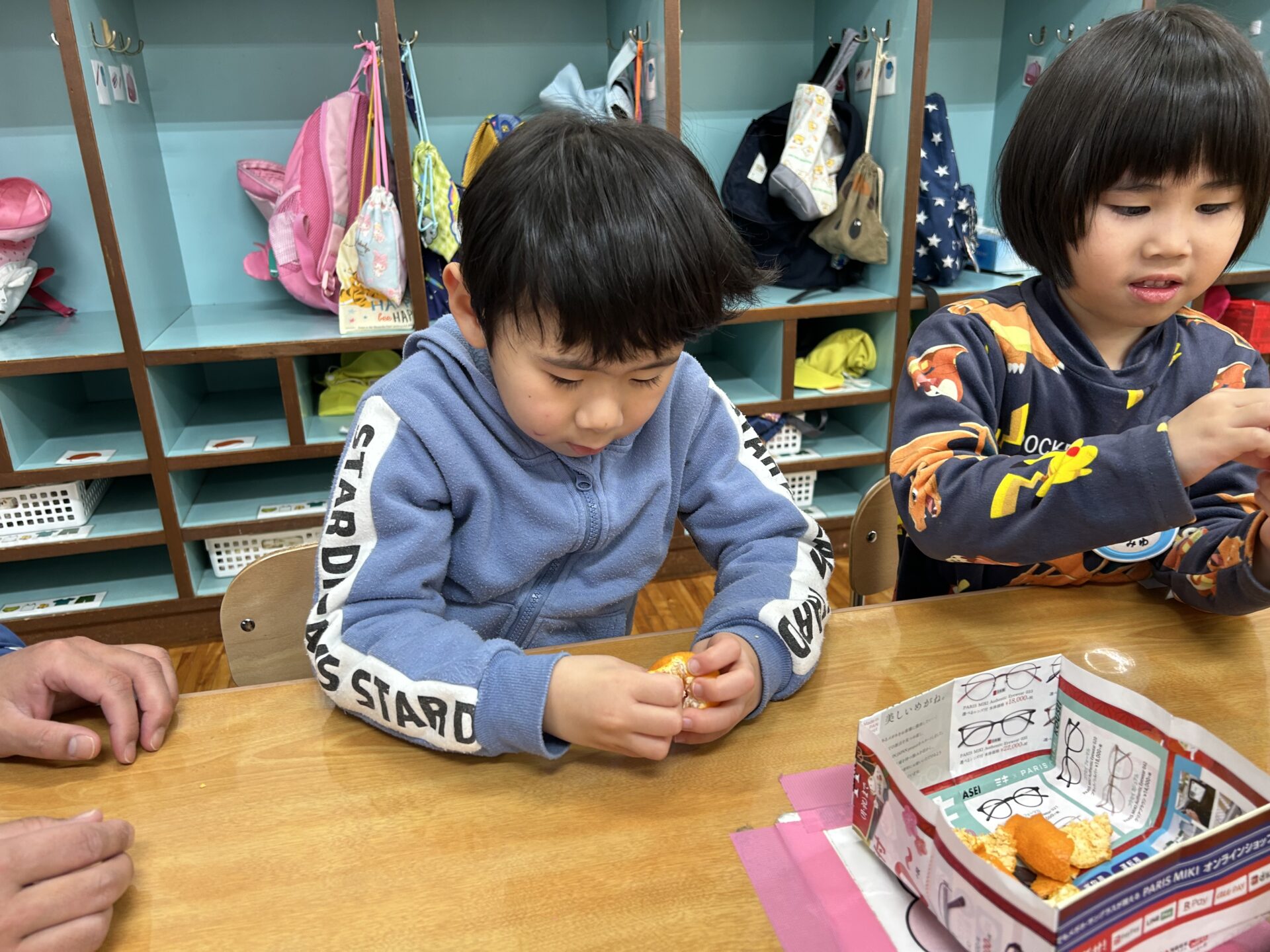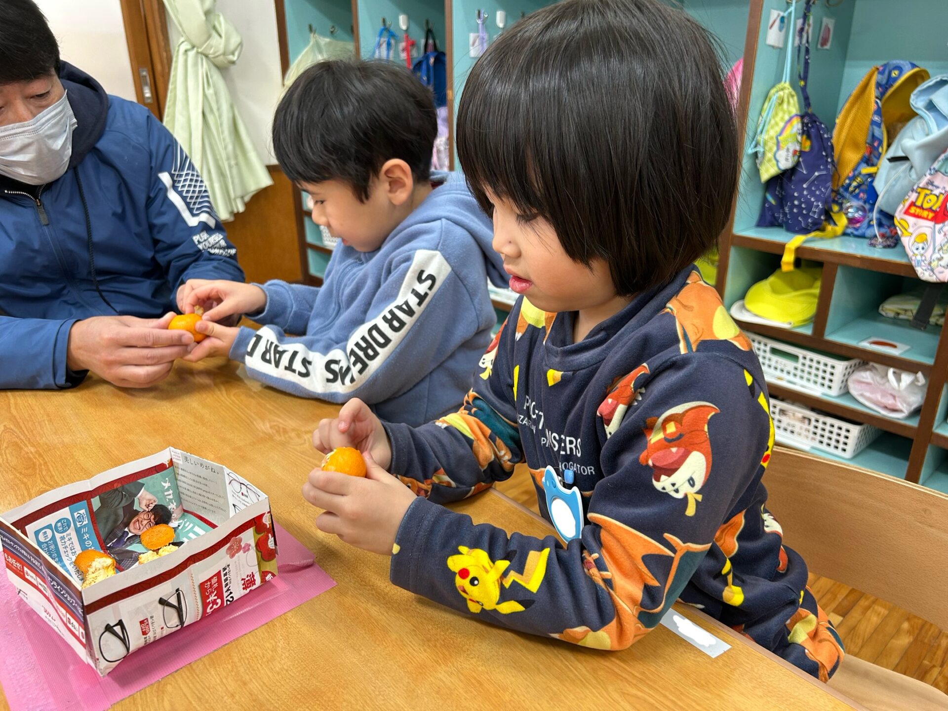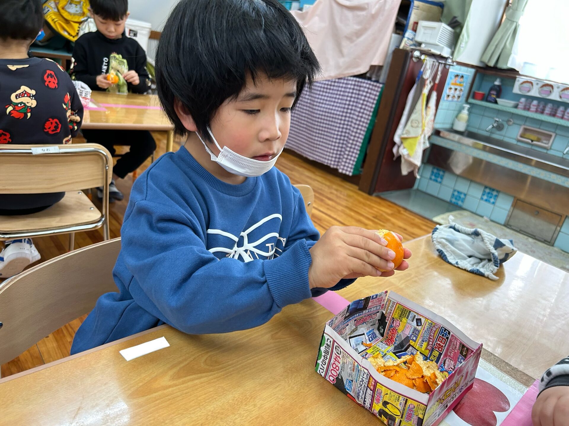 薄いみかんの皮を、真剣な表情で丁寧にむいていましたよ。果肉を見て、「ゼリーみたい」「つぶつぶ」と思いがけないプレゼントがうれしくてはしゃいでいる姿が印象的でした。そして、「いただきまーす」食べる時、みんなニコニコ顔でした。