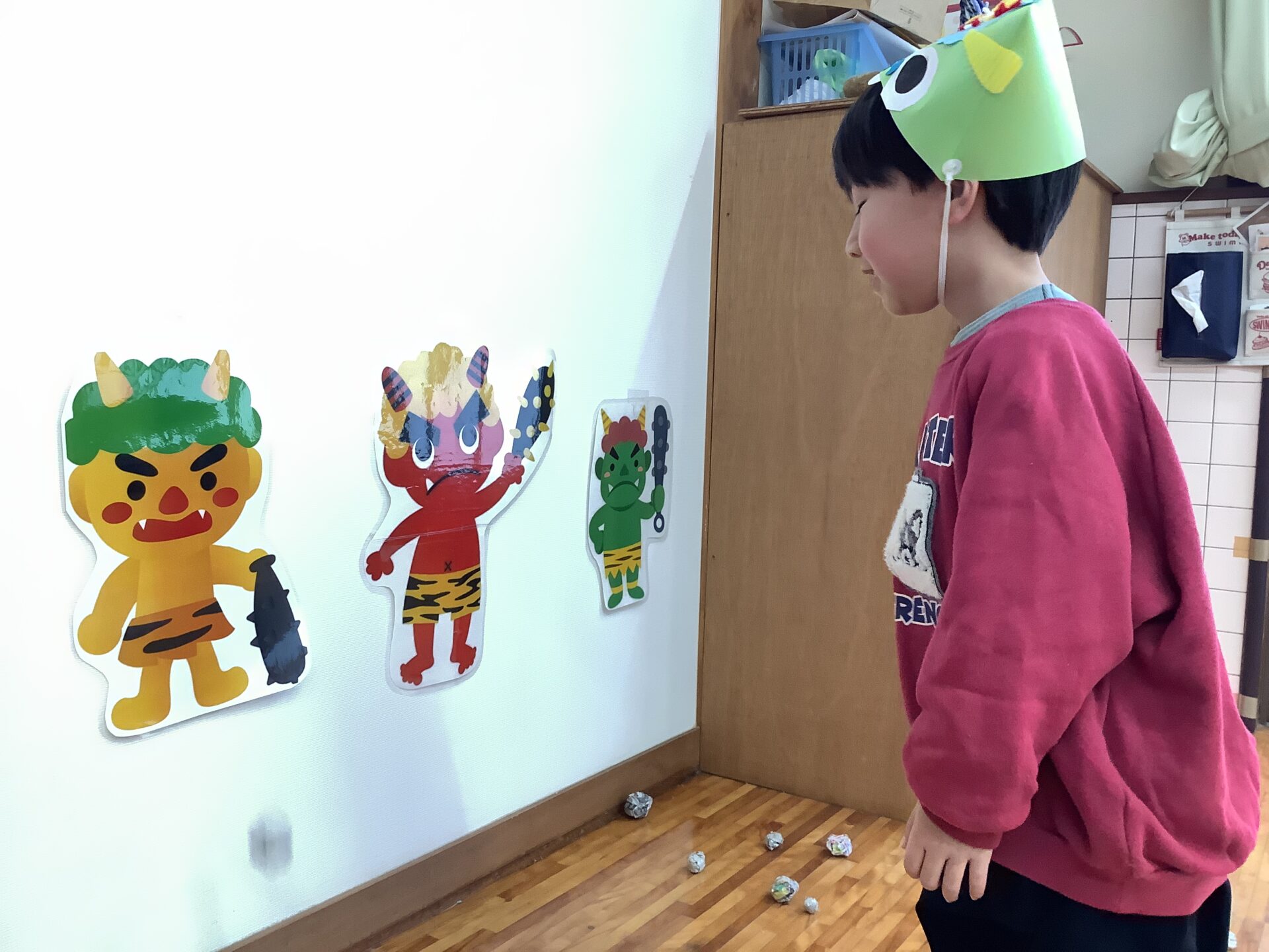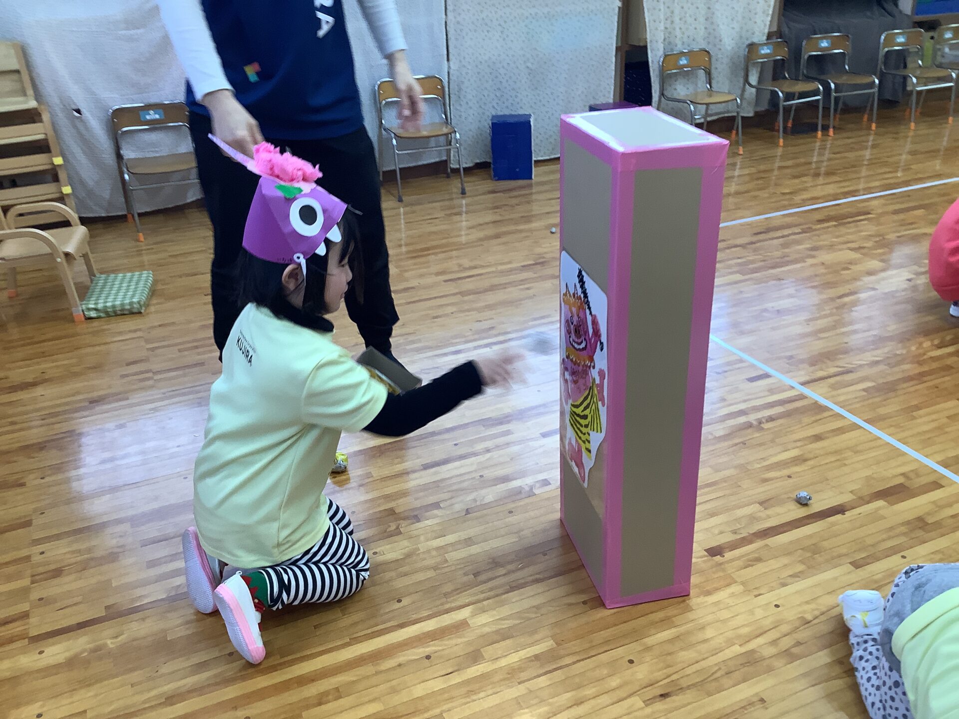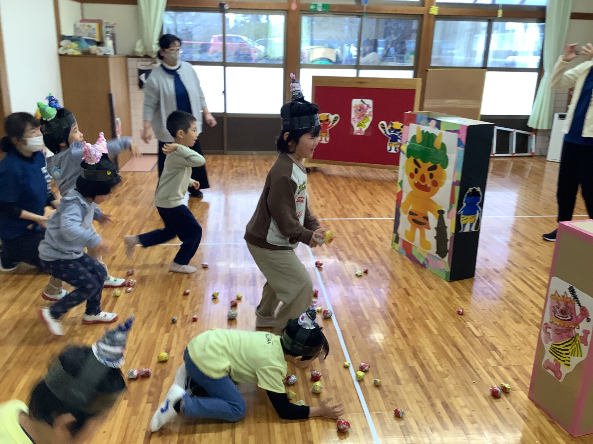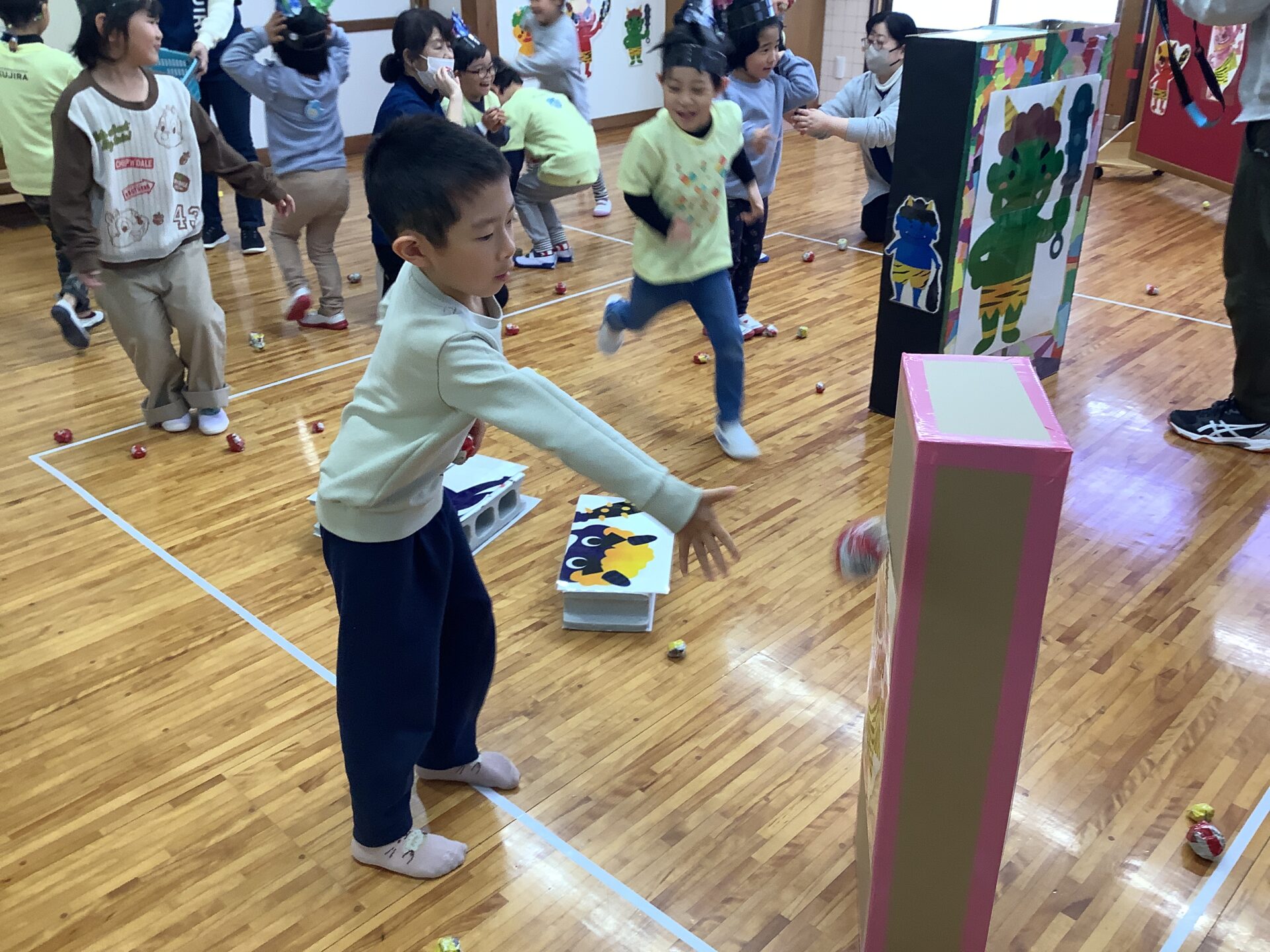 次に、豆まきゲームをしました。まずはにじチーム、そらチームの出番です。箱の大きな鬼や壁面の鬼に向かって「鬼は外ー、福は内!」と言いながら豆まきをしました。