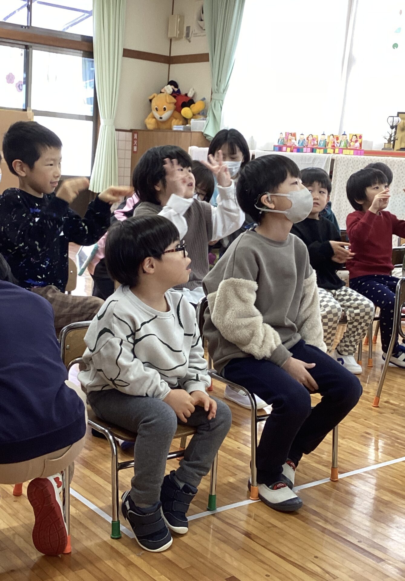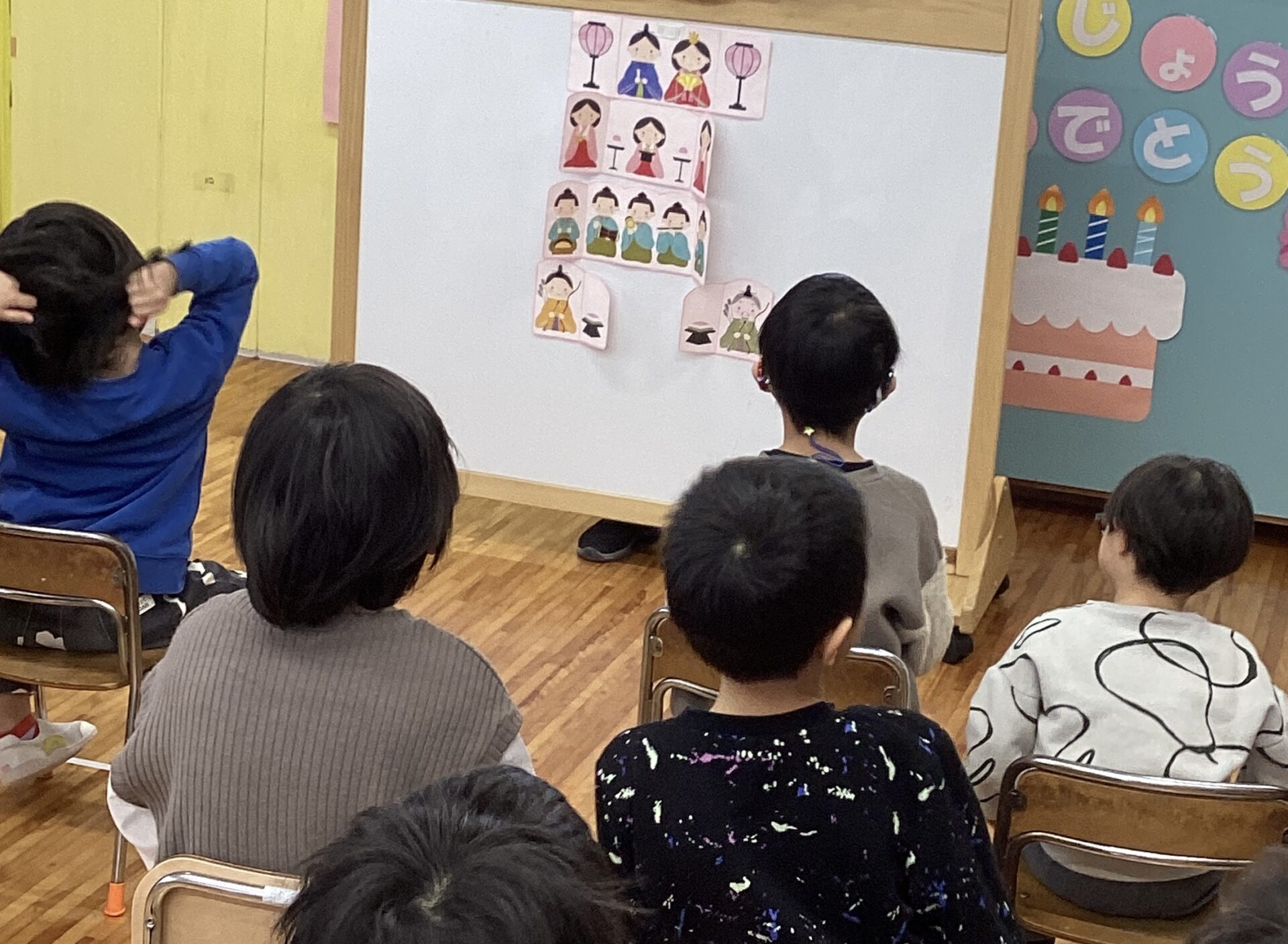 「ひなまつりってなあに」のみんなでスケッチブックシアターを見ました。昔からのおひなさまや由来の話もシアターを見ながら上手に聞けましたよ。