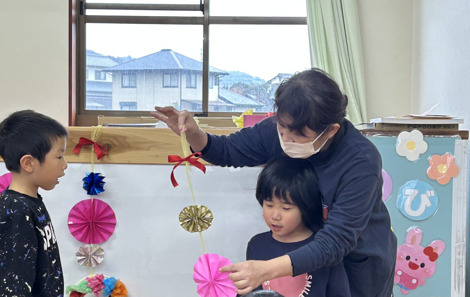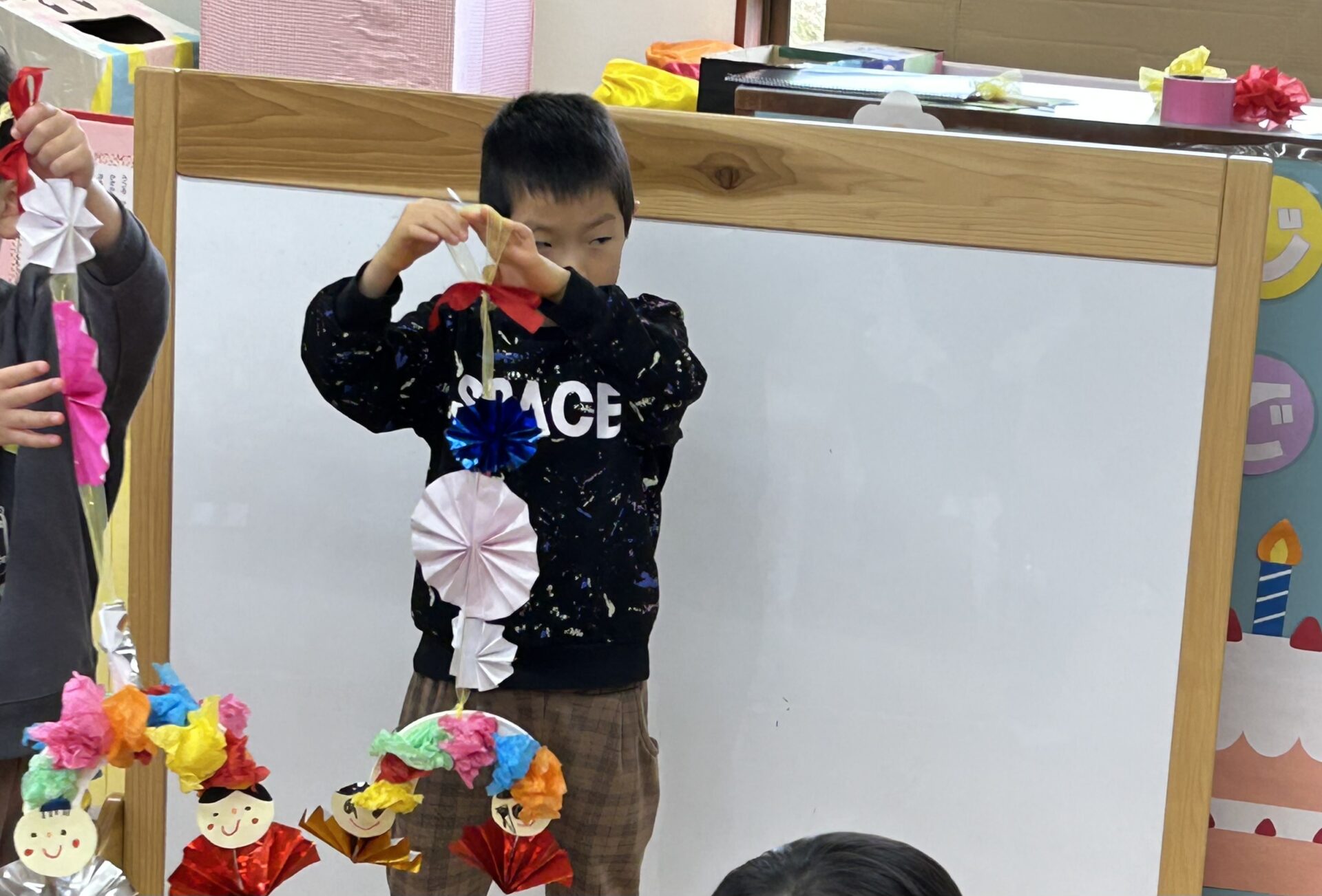 「折り紙を折って、お花を作ったよ」「にじいろの飾りを作ったの」と発表しています。