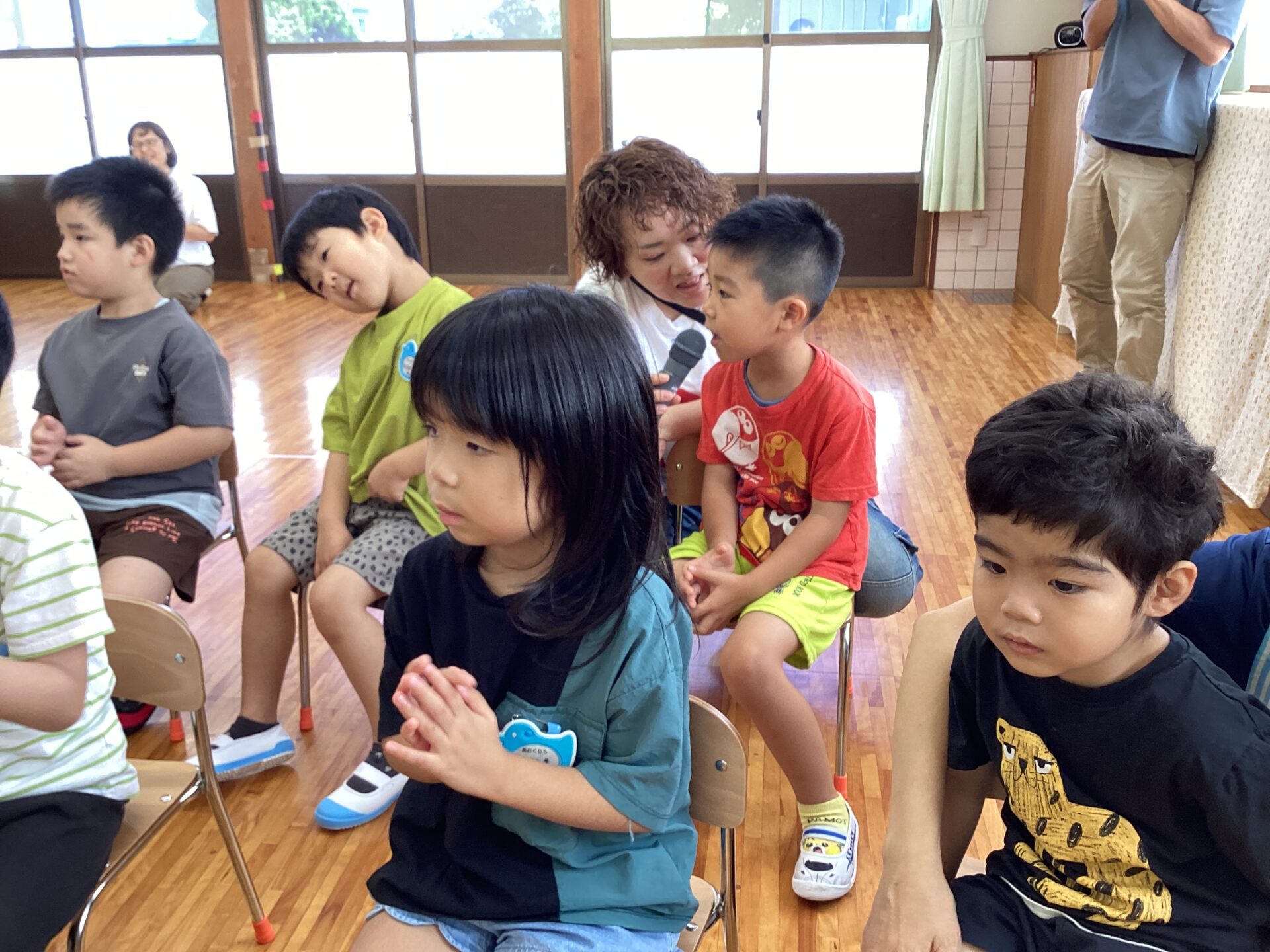みんながホールに集まり、はじまるよ♪の手遊びをしました。保育士を真似して一緒に手遊びをしたり、真剣な表情で保育士に注目したりと、楽しみ方は様々でした。