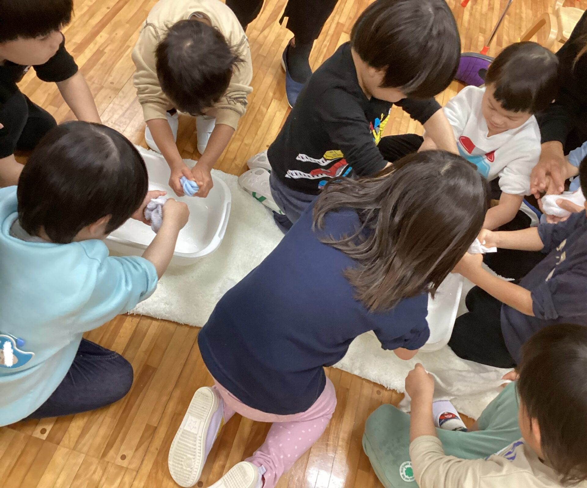 力いっぱいギューっとすると、お水が出ることが面白かったようで、みんな真剣です😆