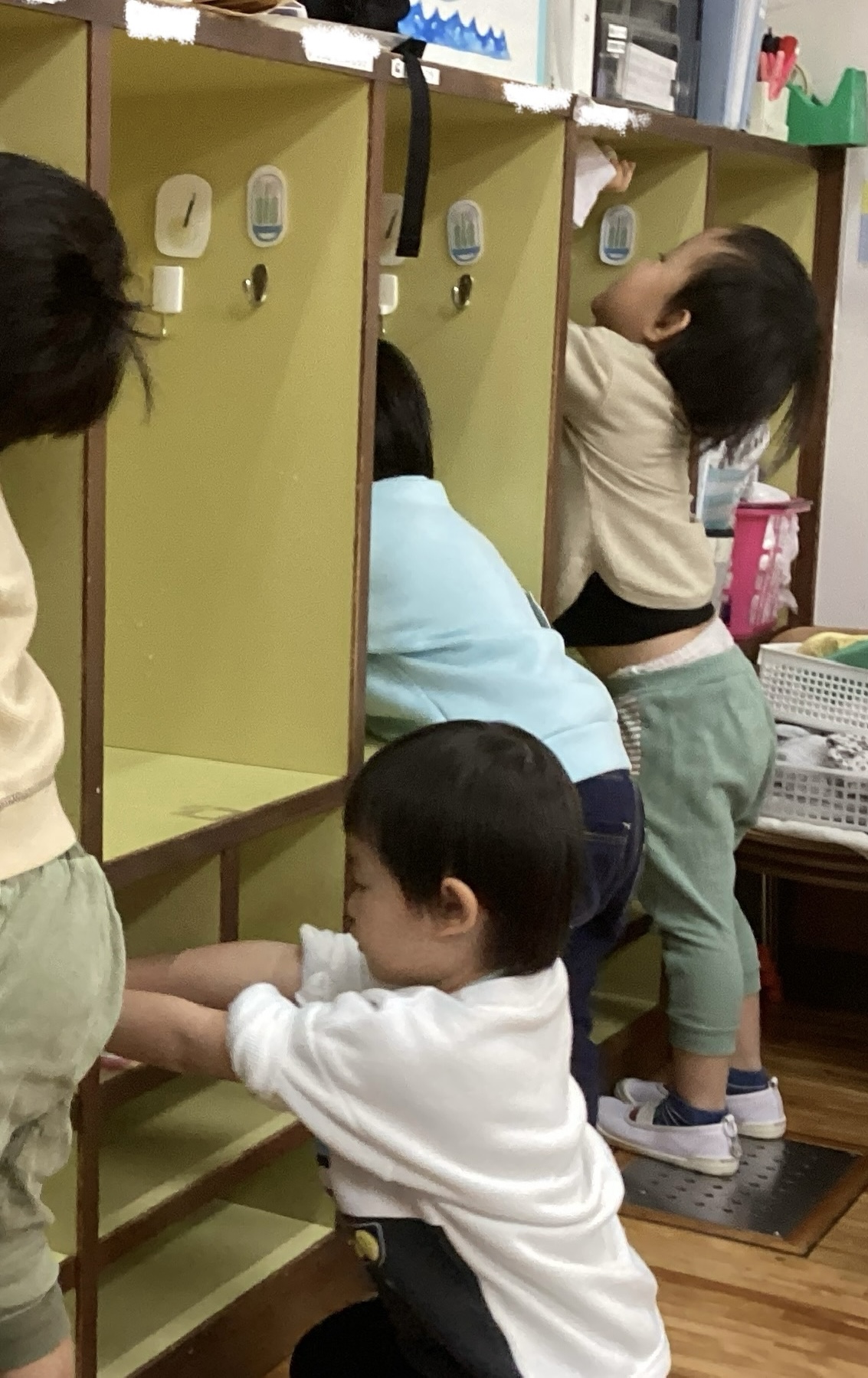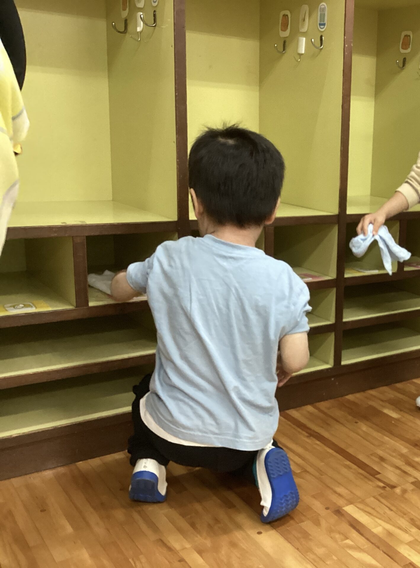 大人がやり方を見せると、椅子の裏側やあし、ロッカーの上側や下の奥の方まで、