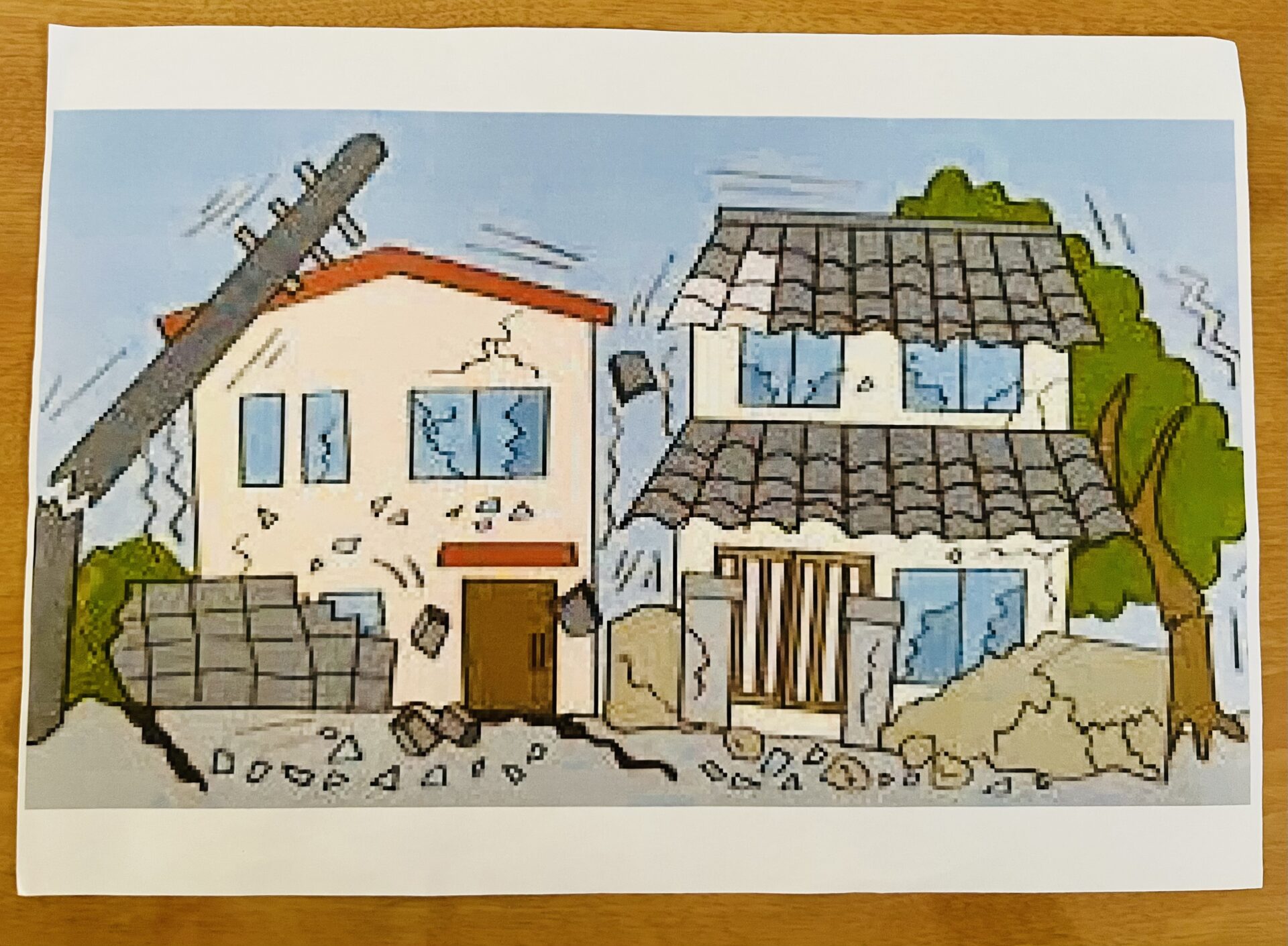 「地震」が来ると、お家が揺れて壊れることがあるよ。