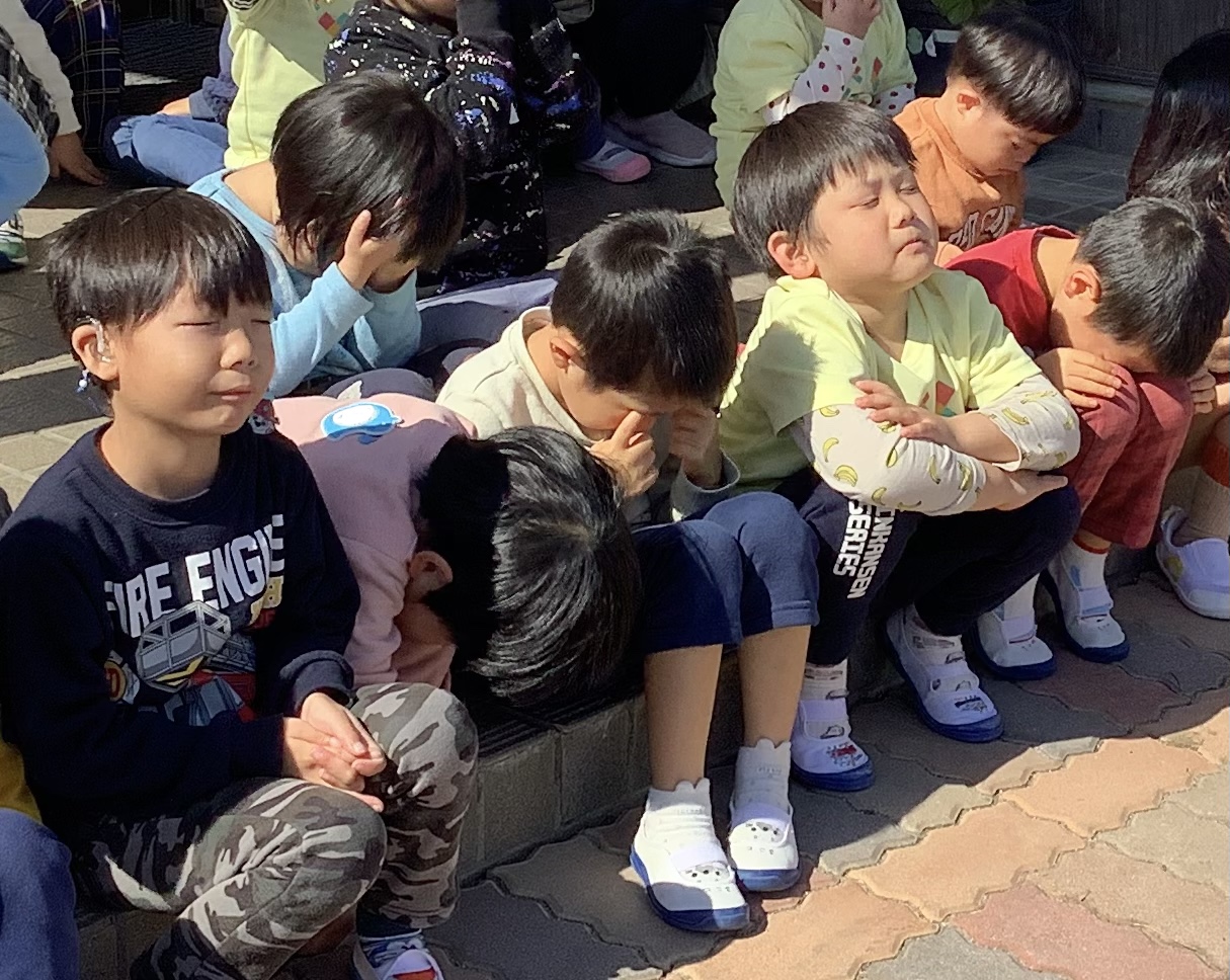 「目をつむる」の説明で、目を隠して伝えた職員を見て、同じく目に手を添えている子ども達。