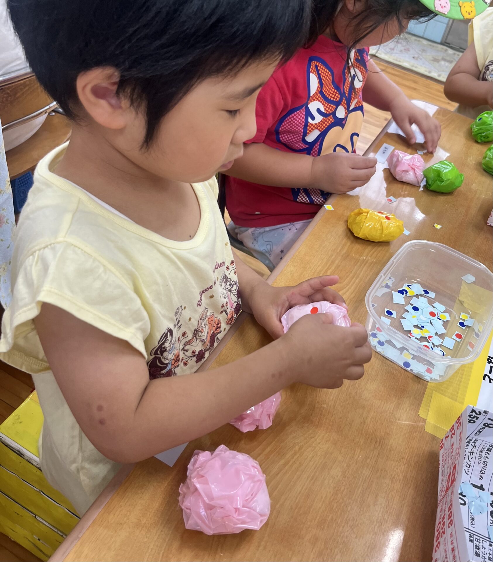 ↑ナイロンでティッシュを包み、丸シールを貼っていきます。