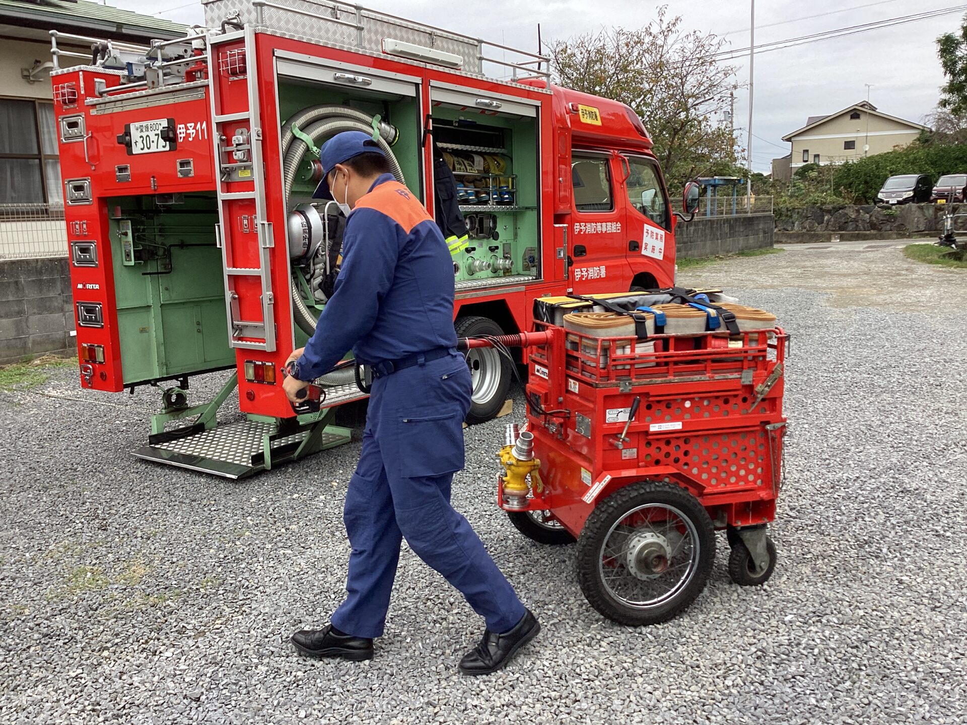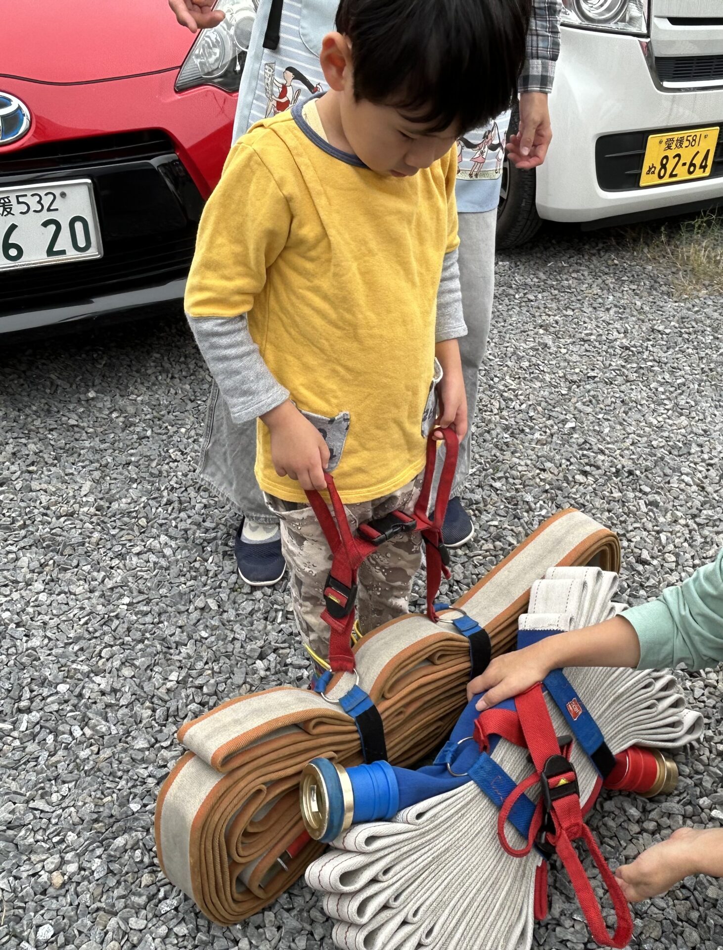 消防車の仕組みや道具に関心を持ち、注目する子も多く実際に持つ体験もしましたよ。