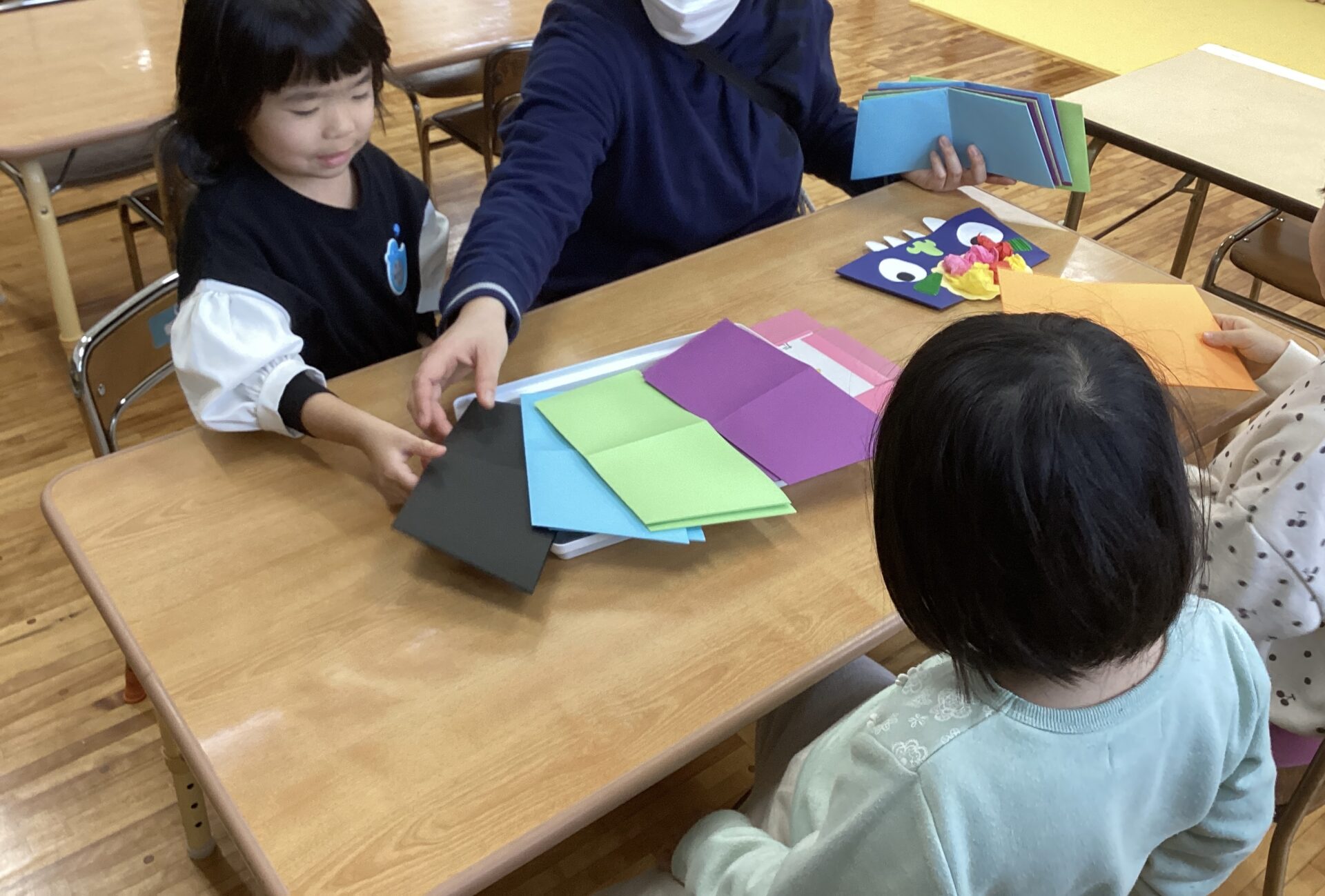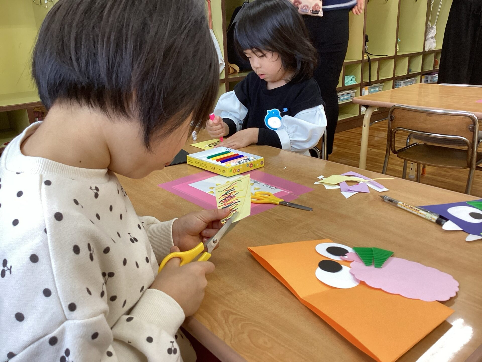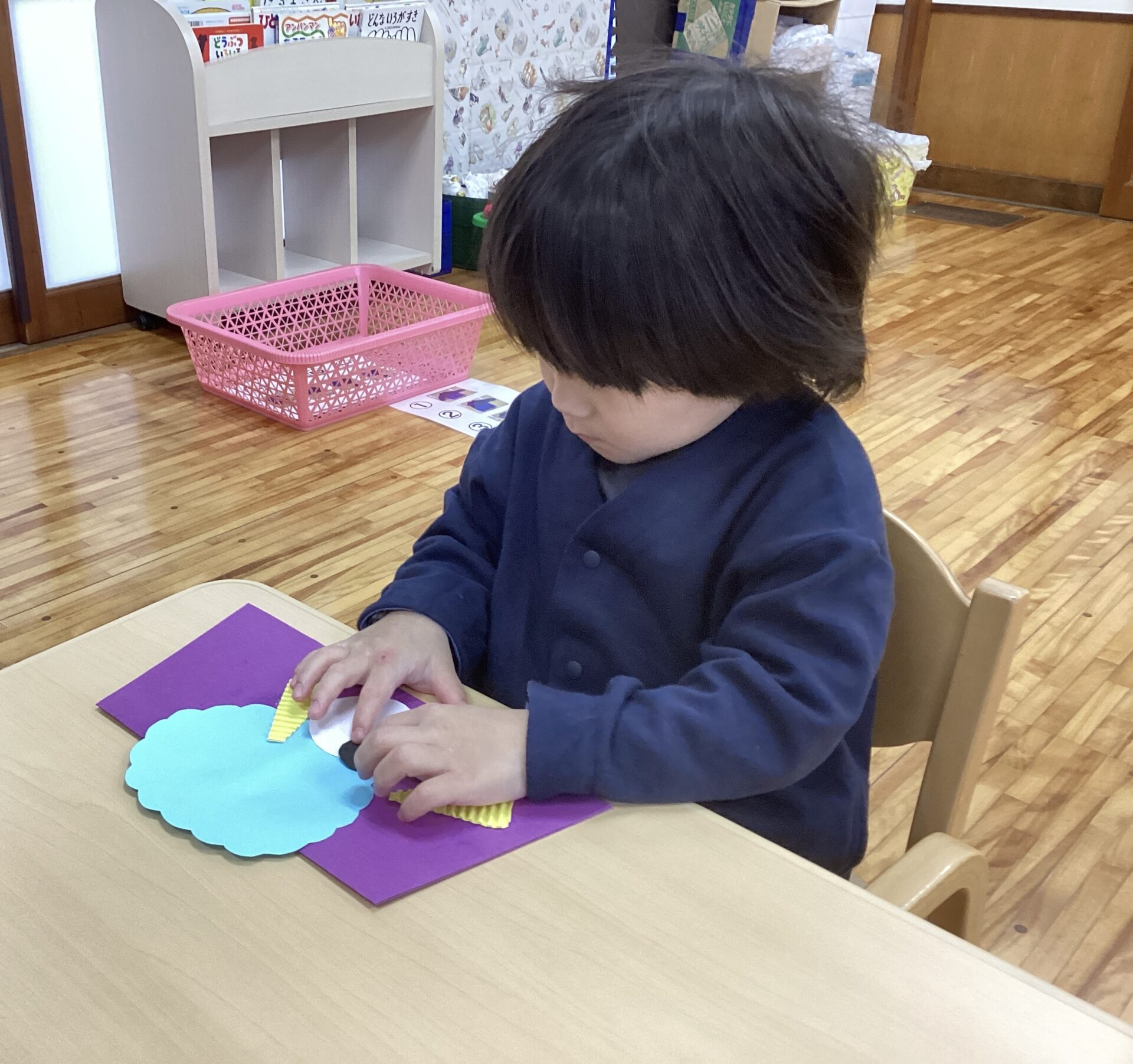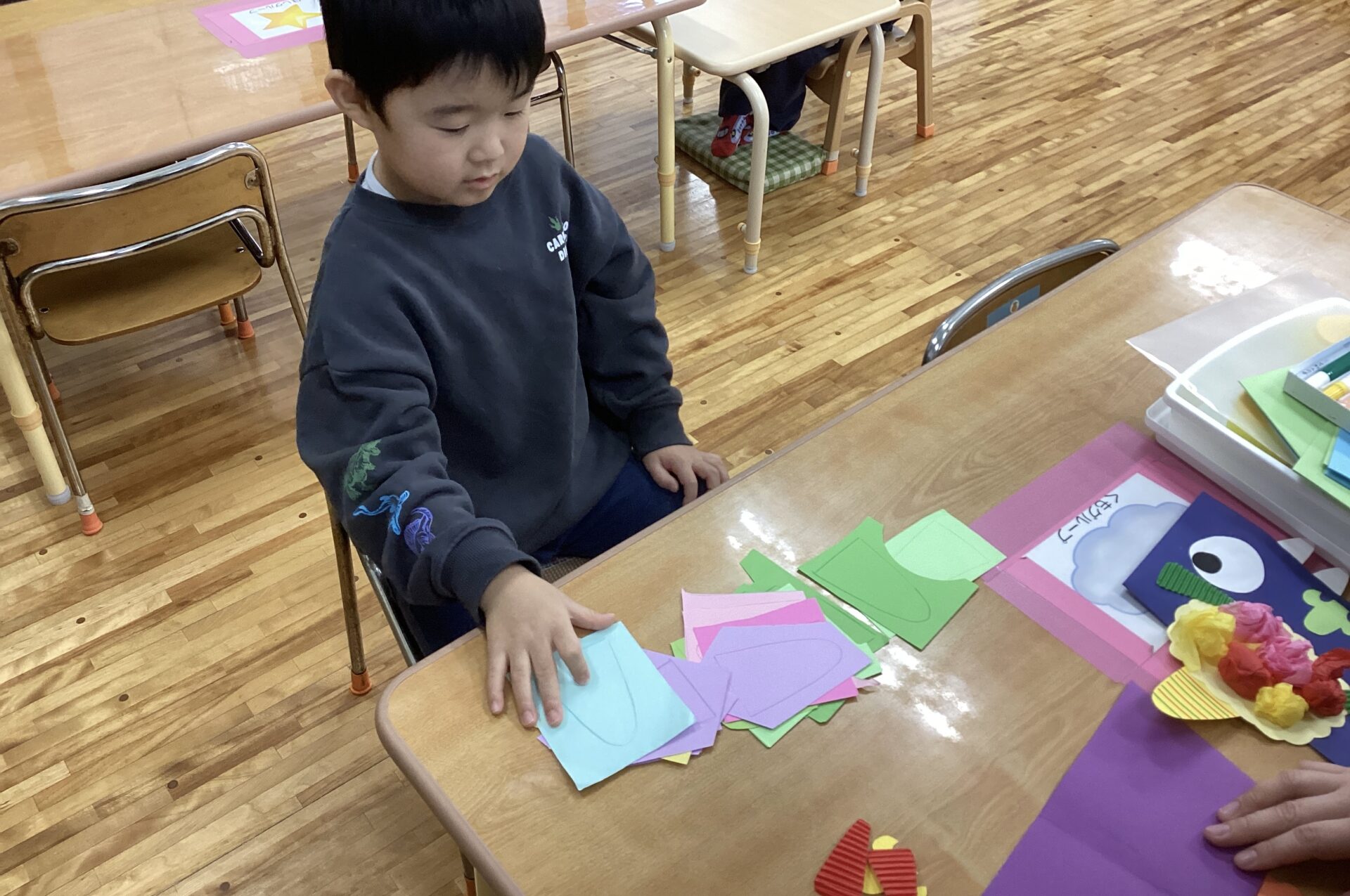 素材や作品の台紙の種類を見せて、「何色にする?」「どっちの髪にする?」と自分で選んでいる所です。