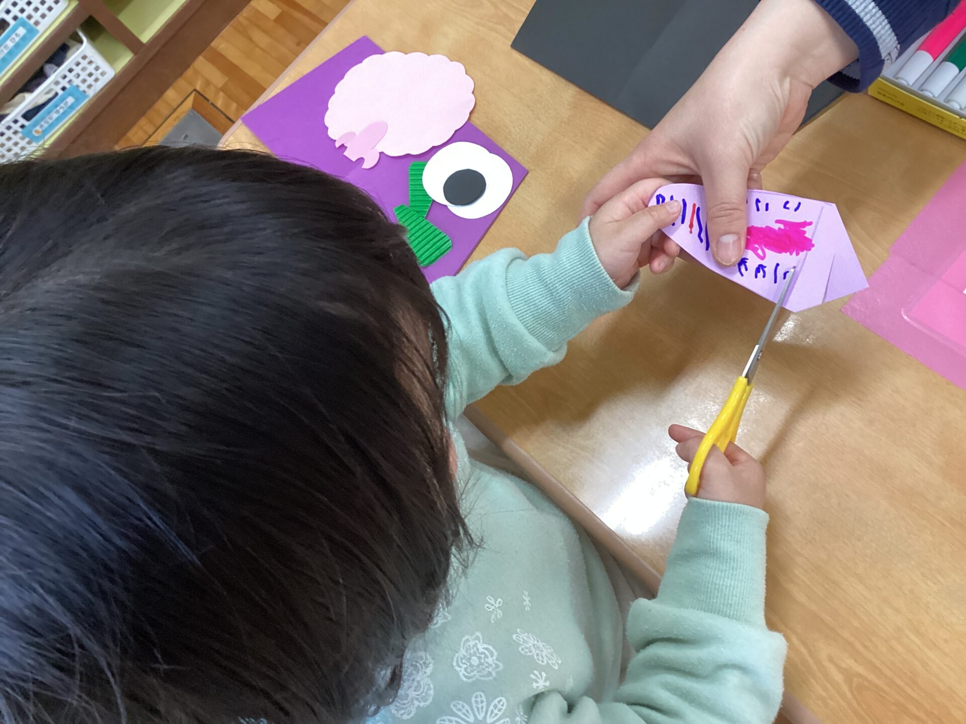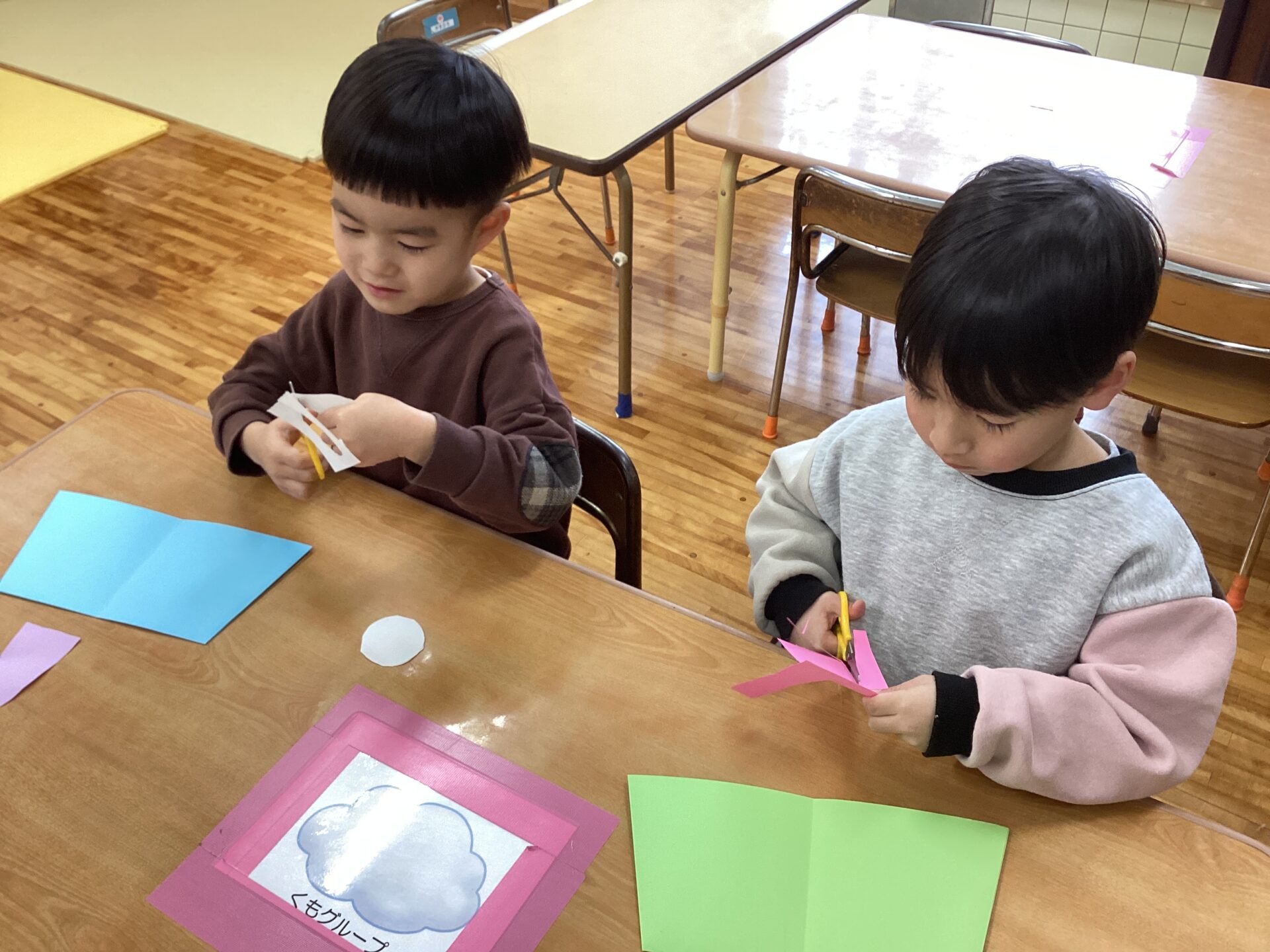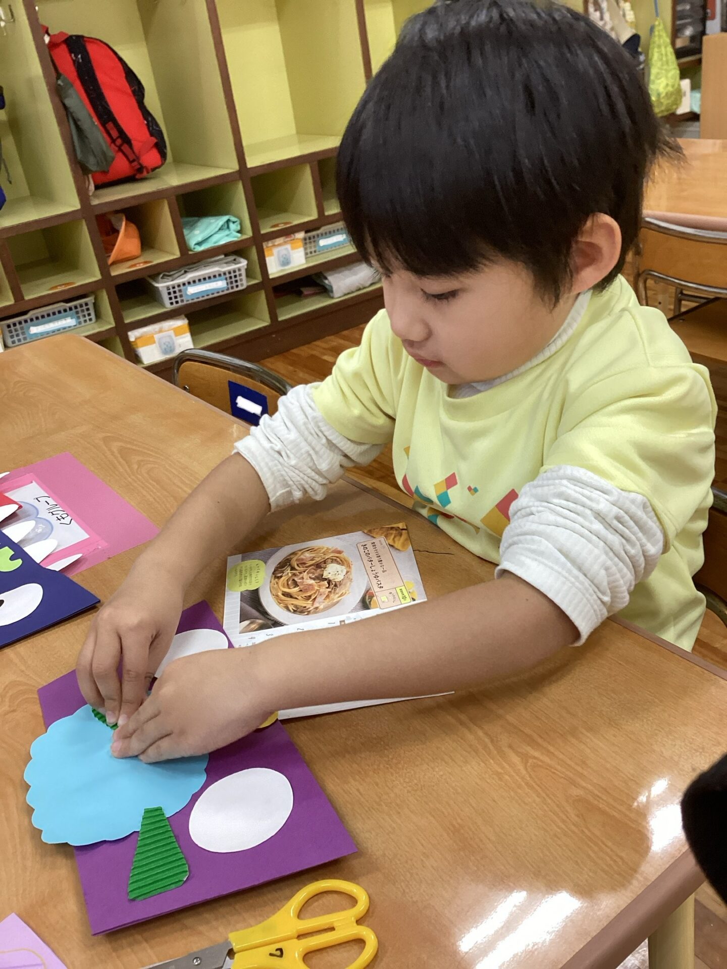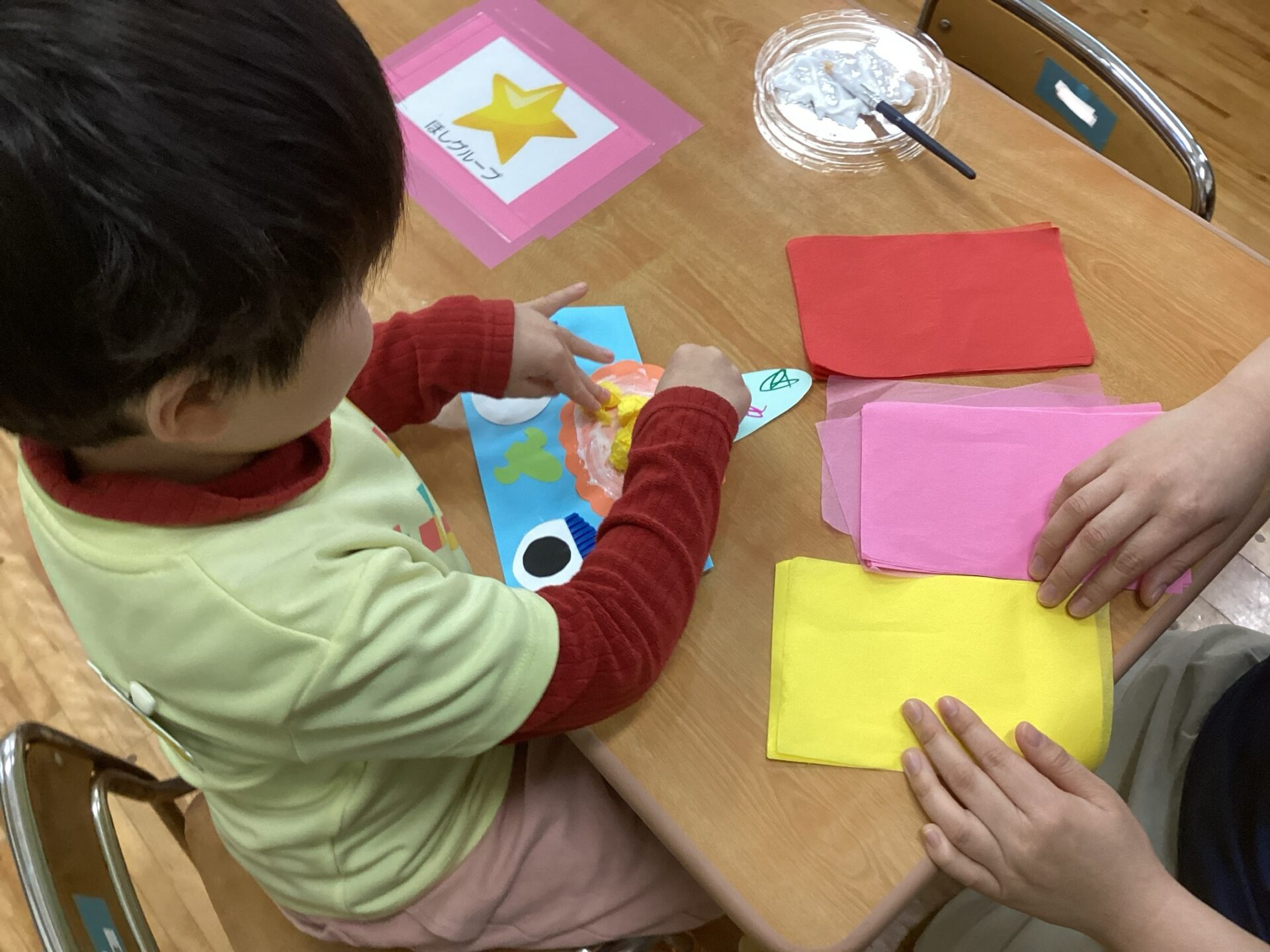 素材や作品の台紙の種類を見せて、「何色にする?」「どっちの髪にする?」と自分で選んでいる所です。