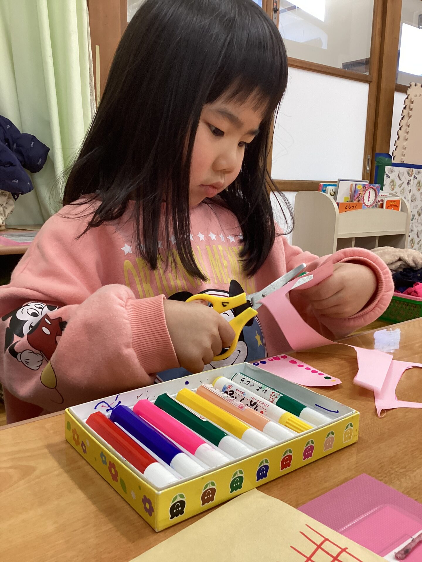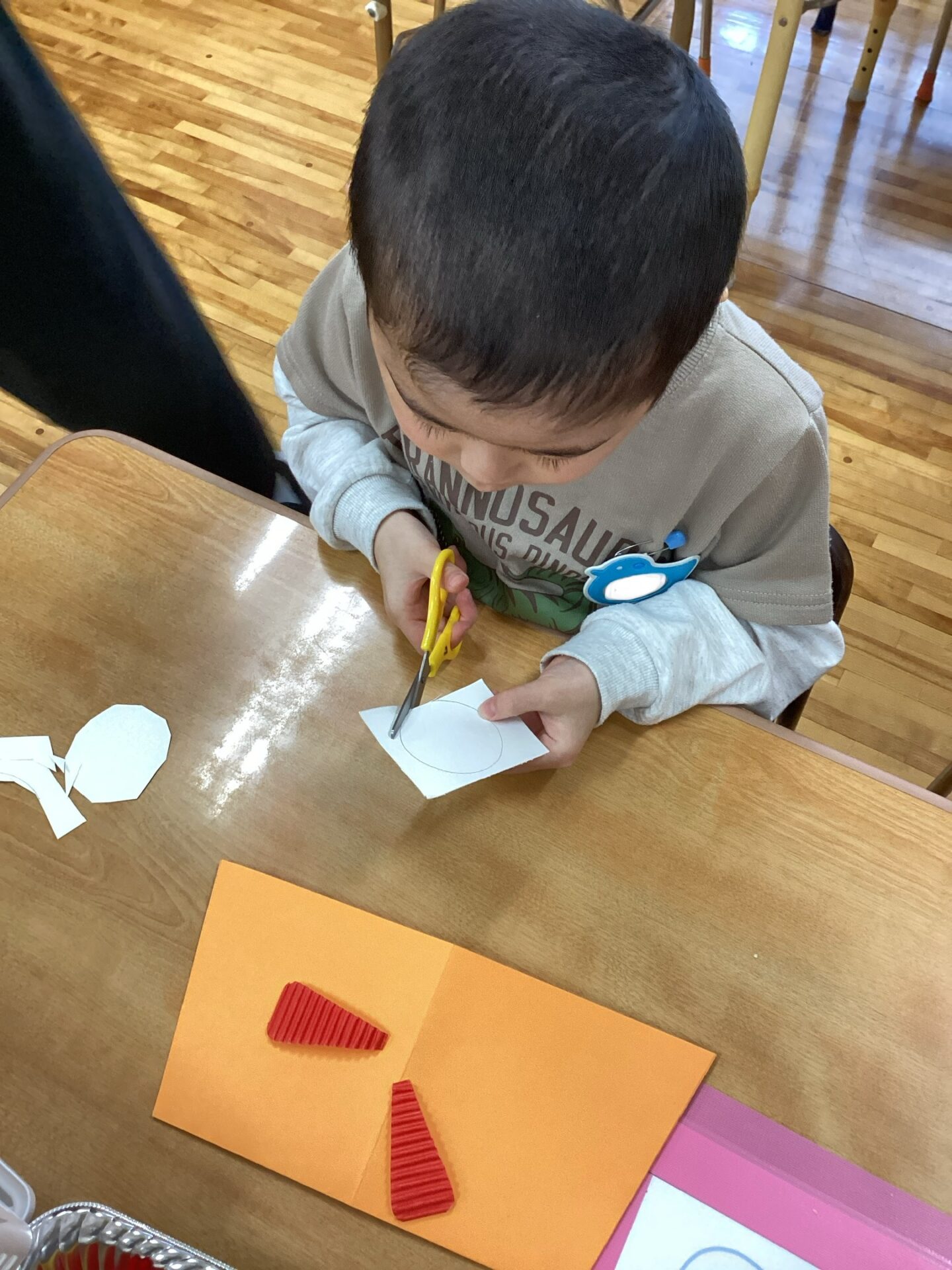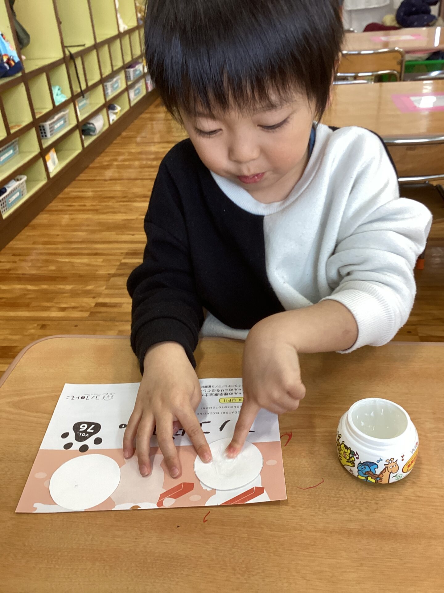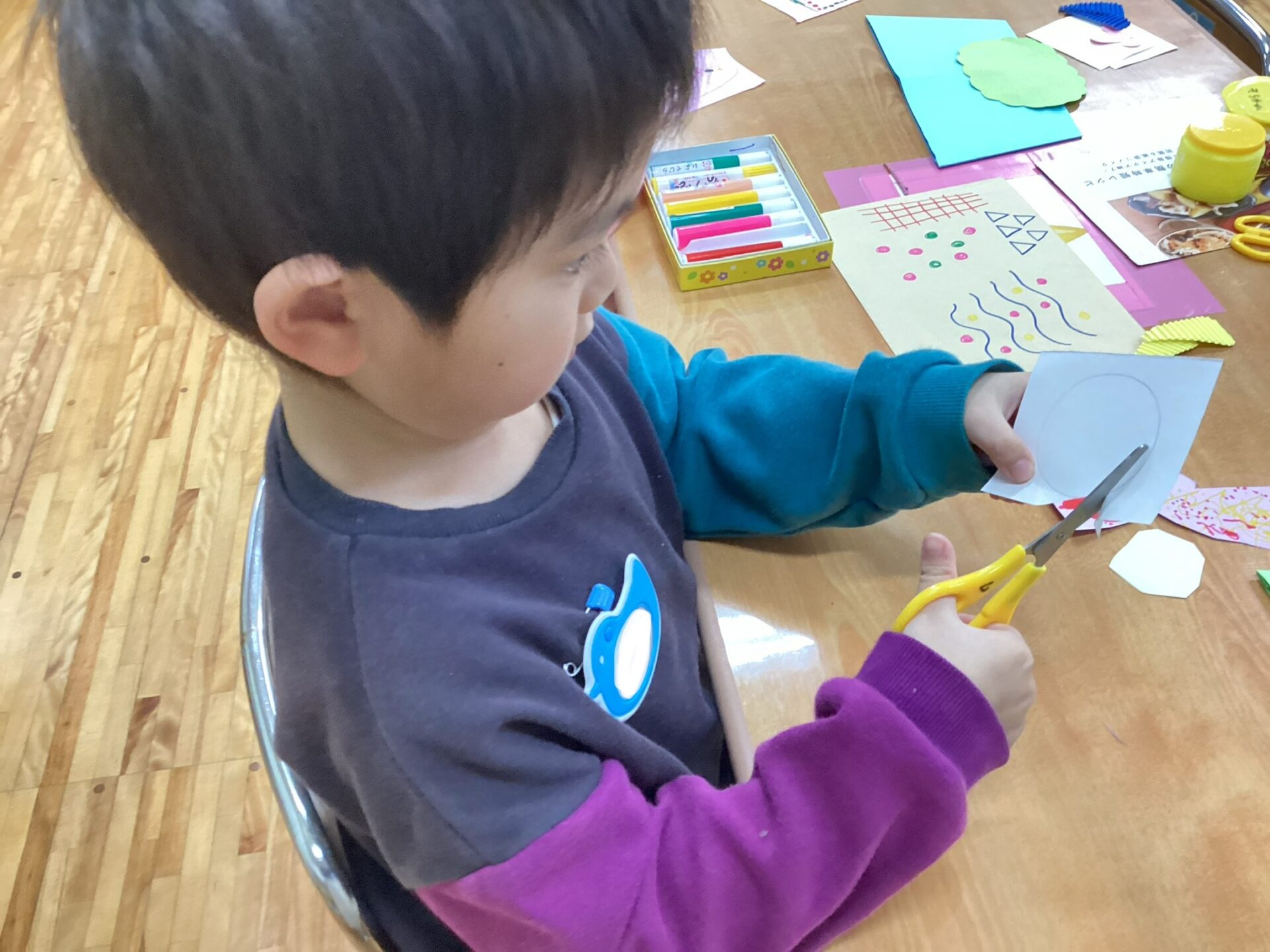 素材や作品の台紙の種類を見せて、「何色にする?」「どっちの髪にする?」と自分で選んでいる所です。