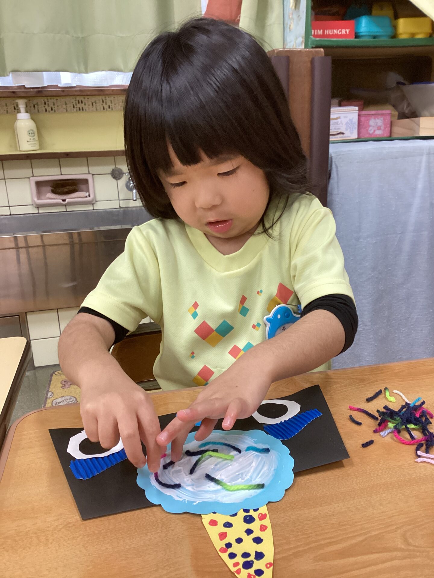 髪の毛は、毛糸やお花紙を使って表現しました。