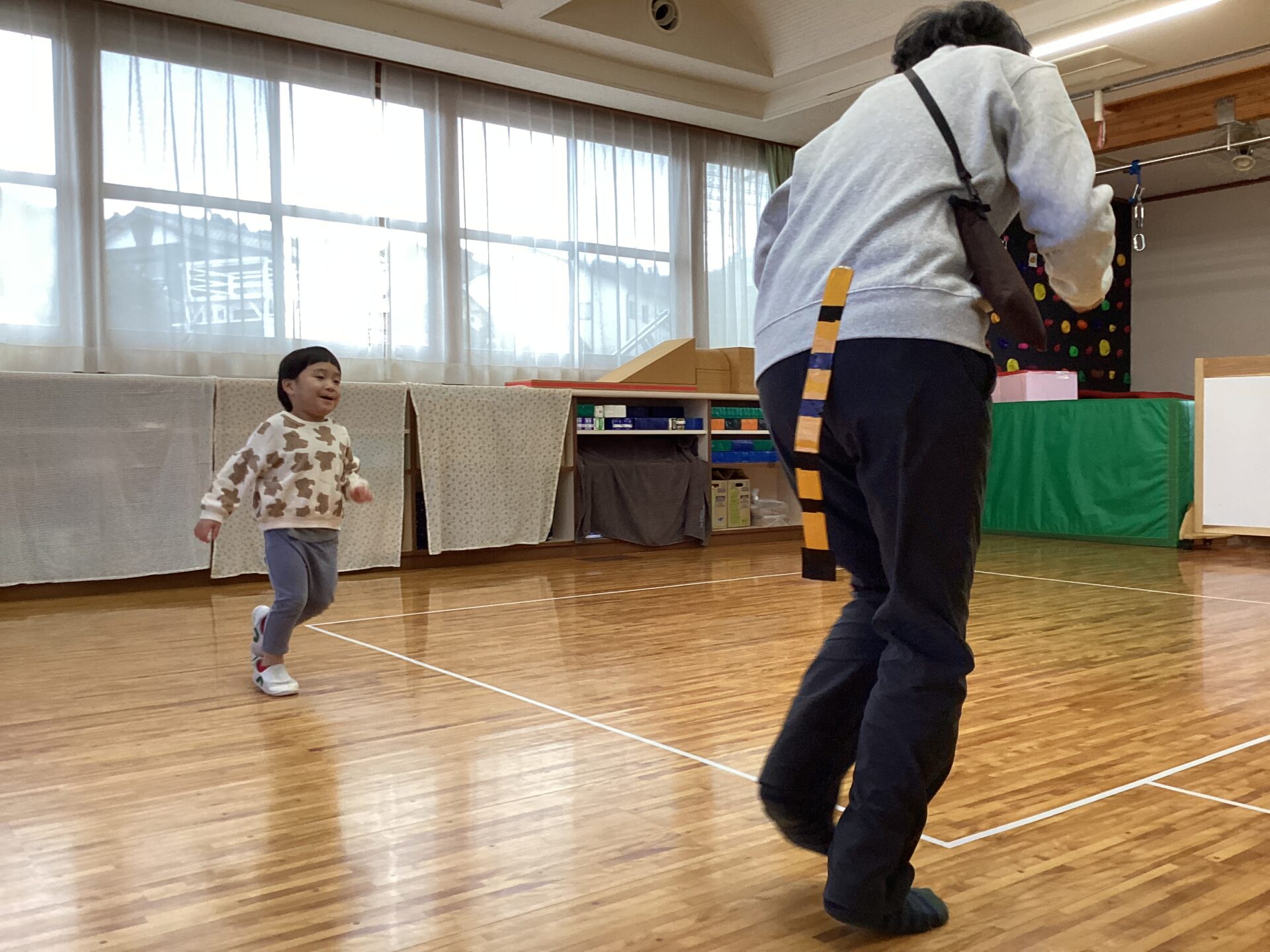 続けていくうちに「先生がみんなのしっぽを取るから逃げてねー!」「せーの!」と声をかけると、みんなで追いかけっこしながらうれしくて大きな声や、笑顔が見られましたよ。楽しかったね。またみんなでオニごっこやろうね!