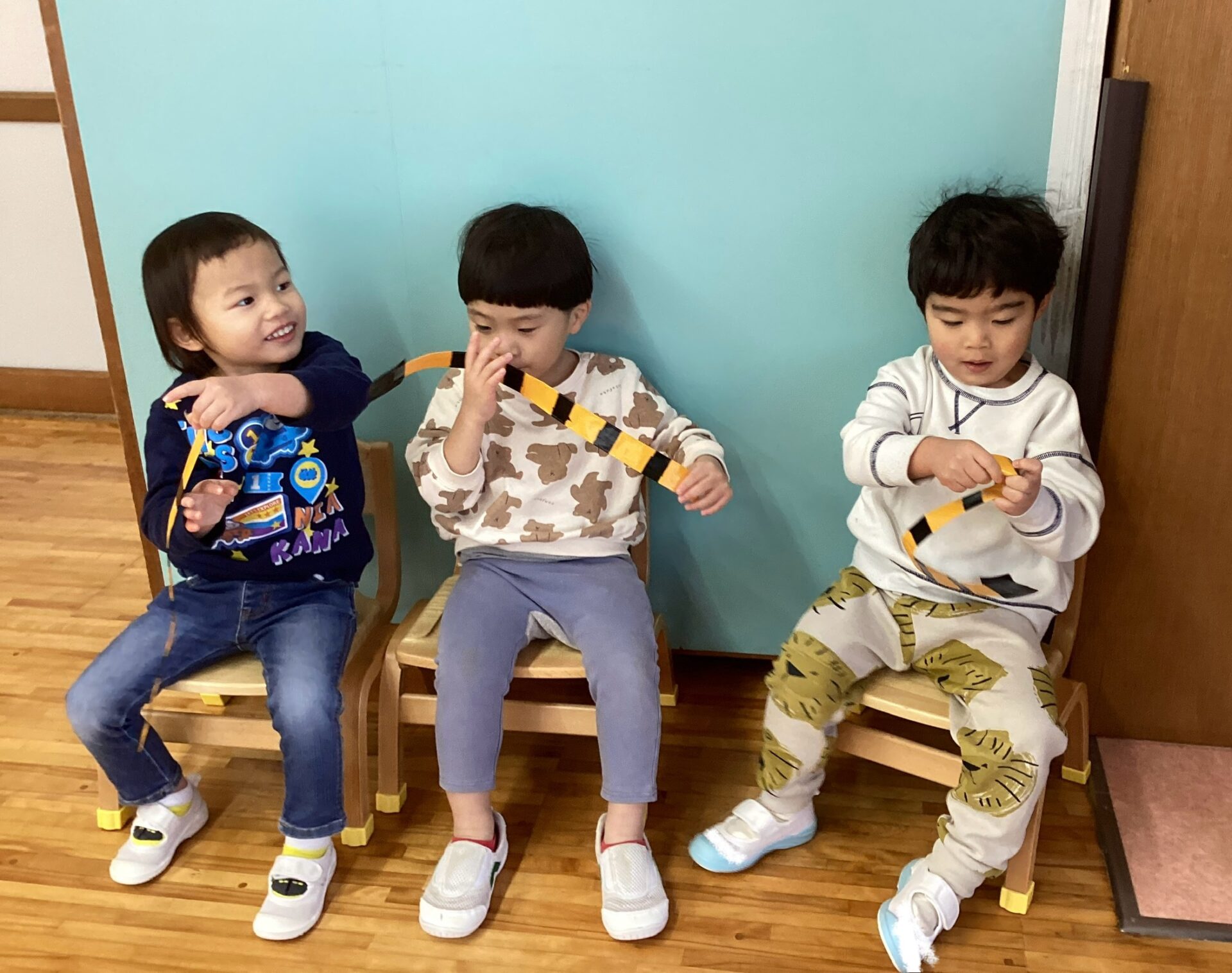 しっぽはYくんの大好きな踏み切りカラー。トラのしっぽにして注目しやすい工夫をしました。「せんせいのしっぽ取るんだよー!」視覚提示しながらルールを伝え、職員と子ども(1人ずつ)でスタート!職員が走って逃げると、追いかけて走ります。しっぽを取ろうと手が伸びて引っ張り取ることに成功!やったね!しっぽを持って椅子に座って待っていてね。順番にゲームができました!