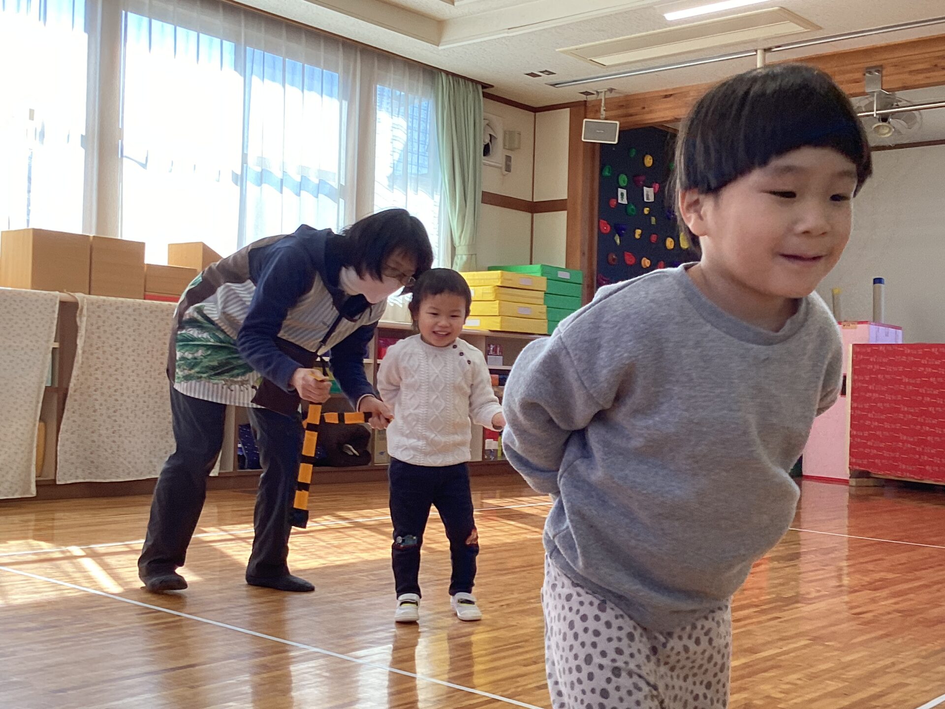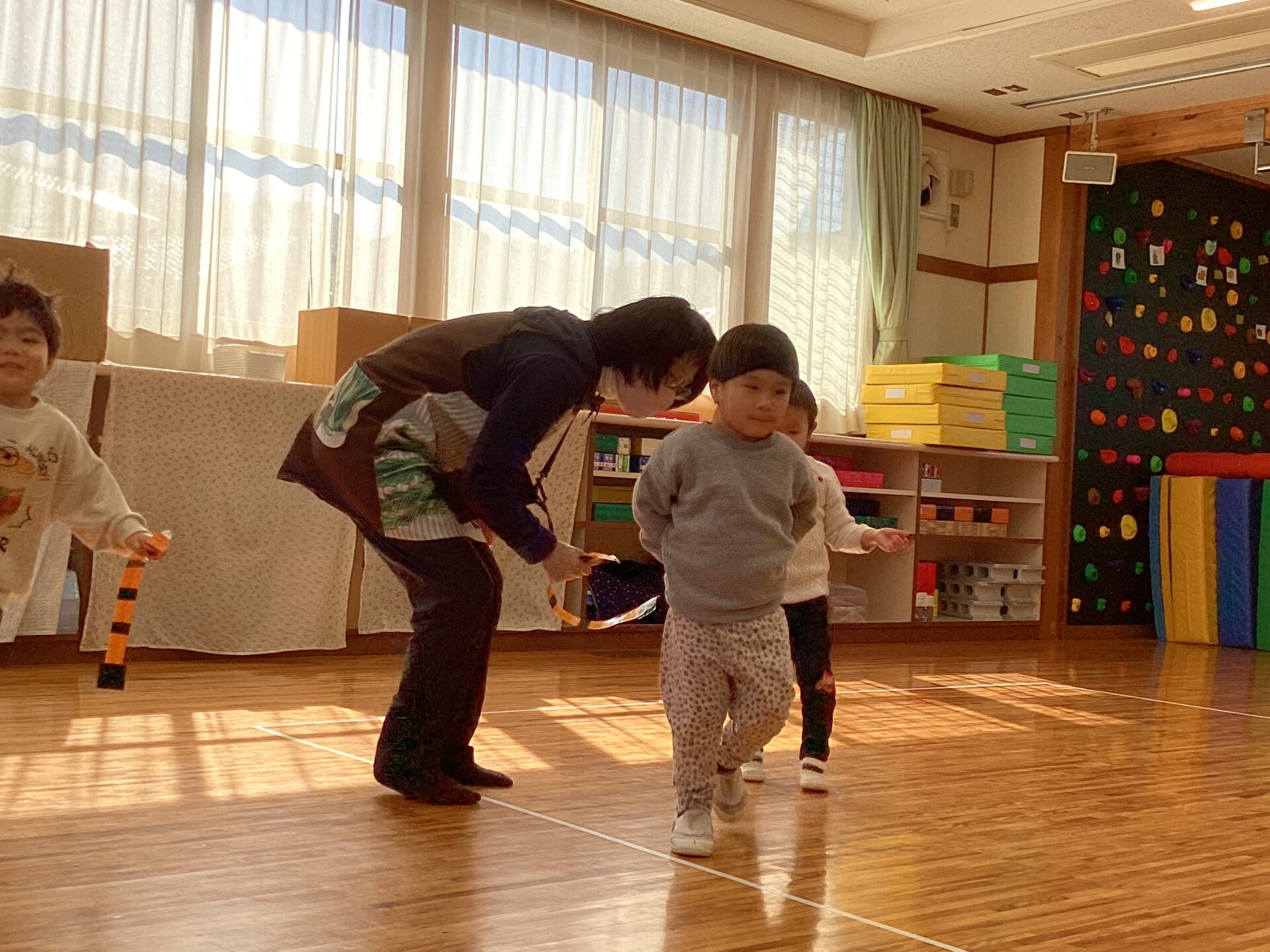 職員のしっぽを取ることが楽しめるようになったので、2回目は子どもたちにしっぽを付けて、職員と一緒に走ります。中には自分のしっぽが取られる!とイメージがしっかりできて「いや おしまい」と言葉で伝える子もいました。