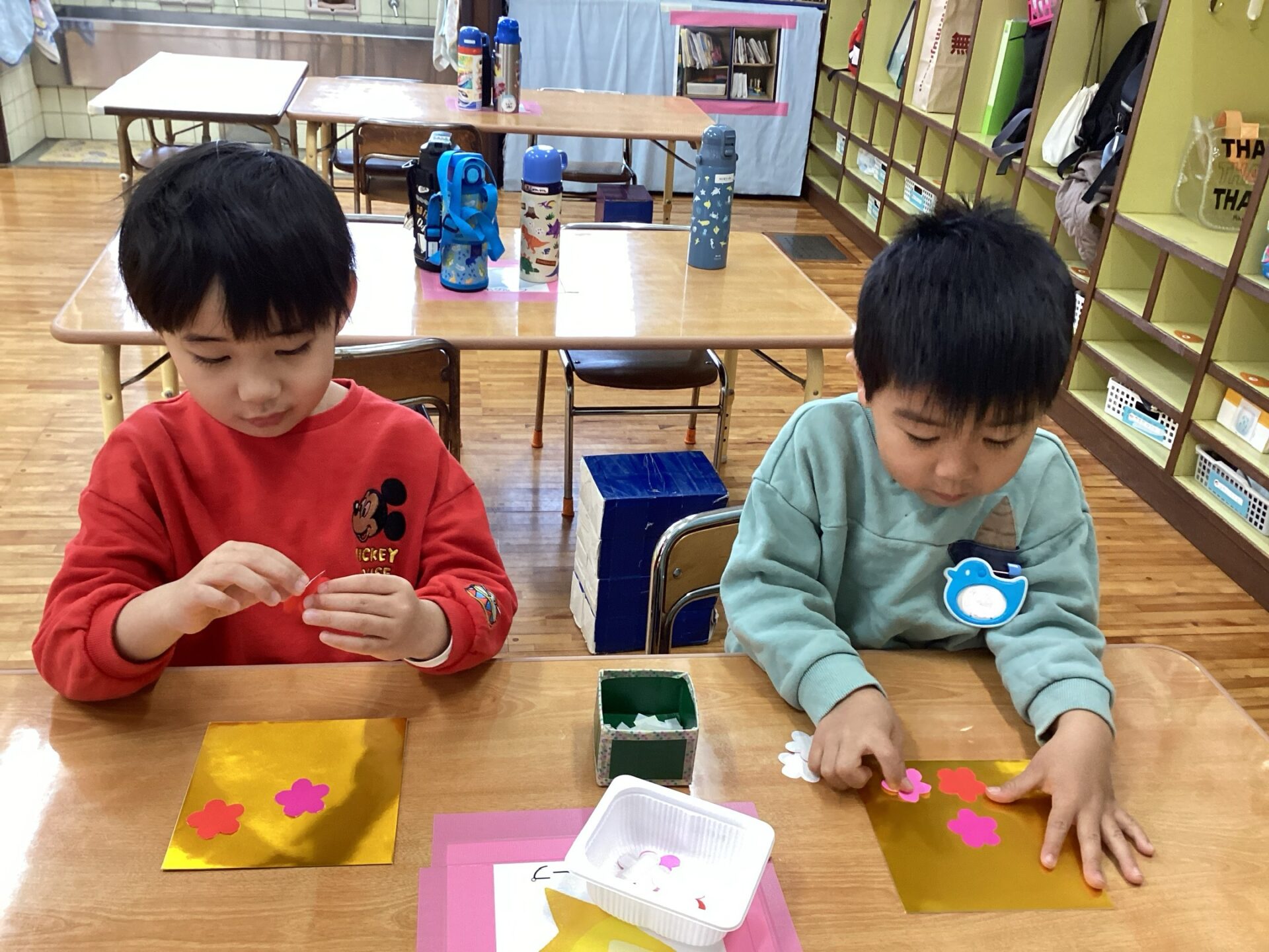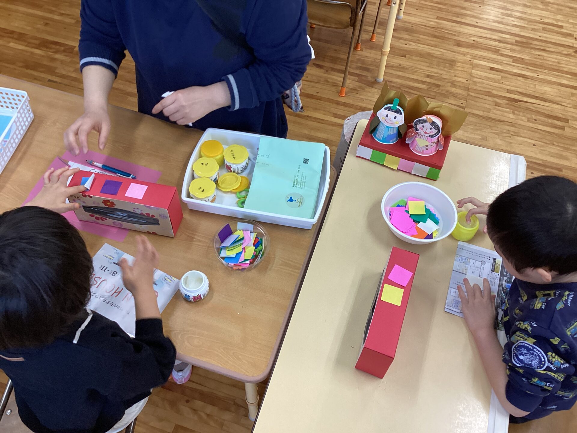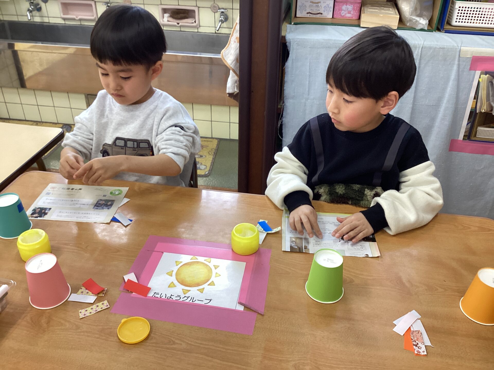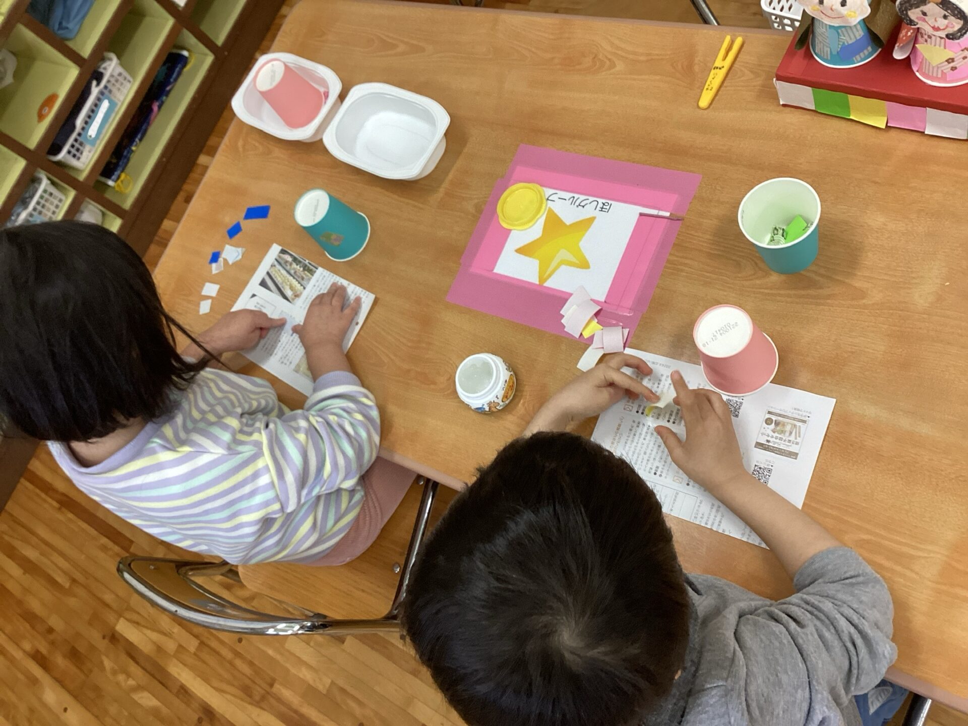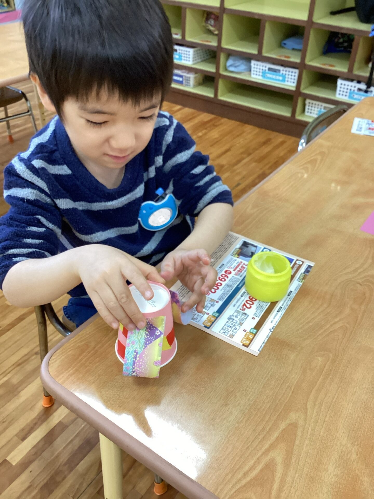 紙コップや千代紙を選んで、ノリで貼り付けているところです。