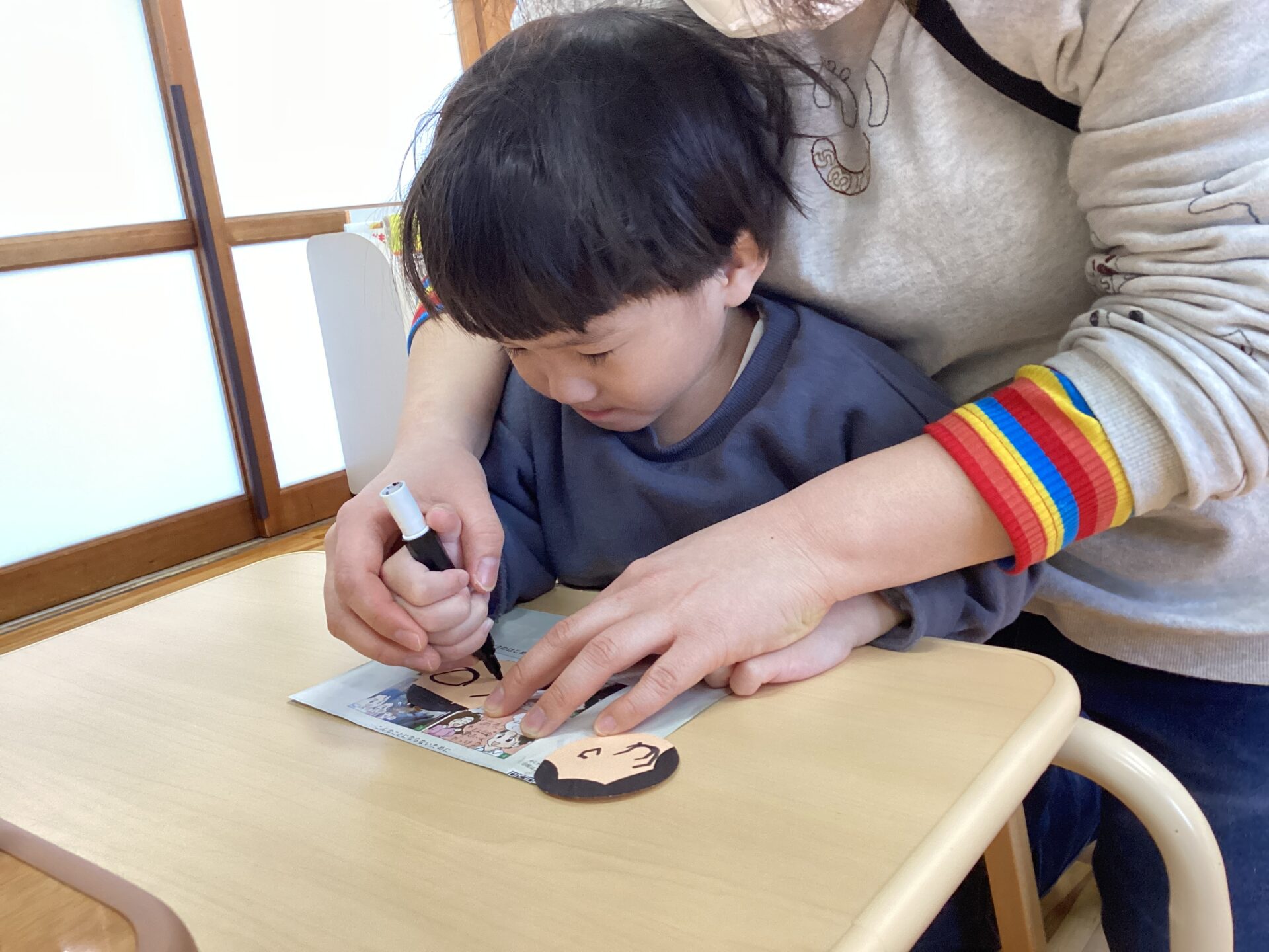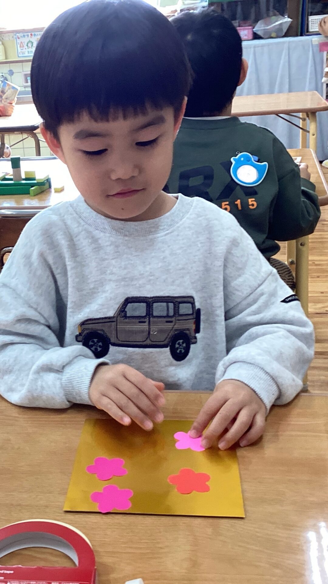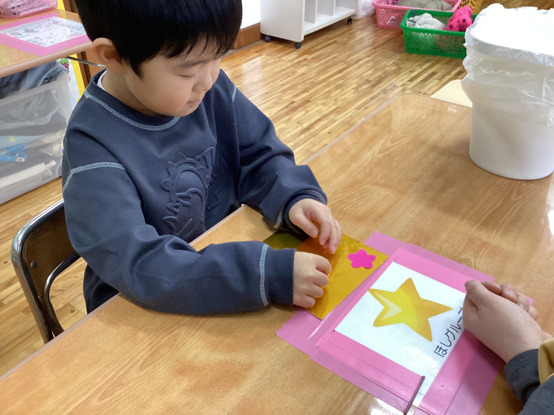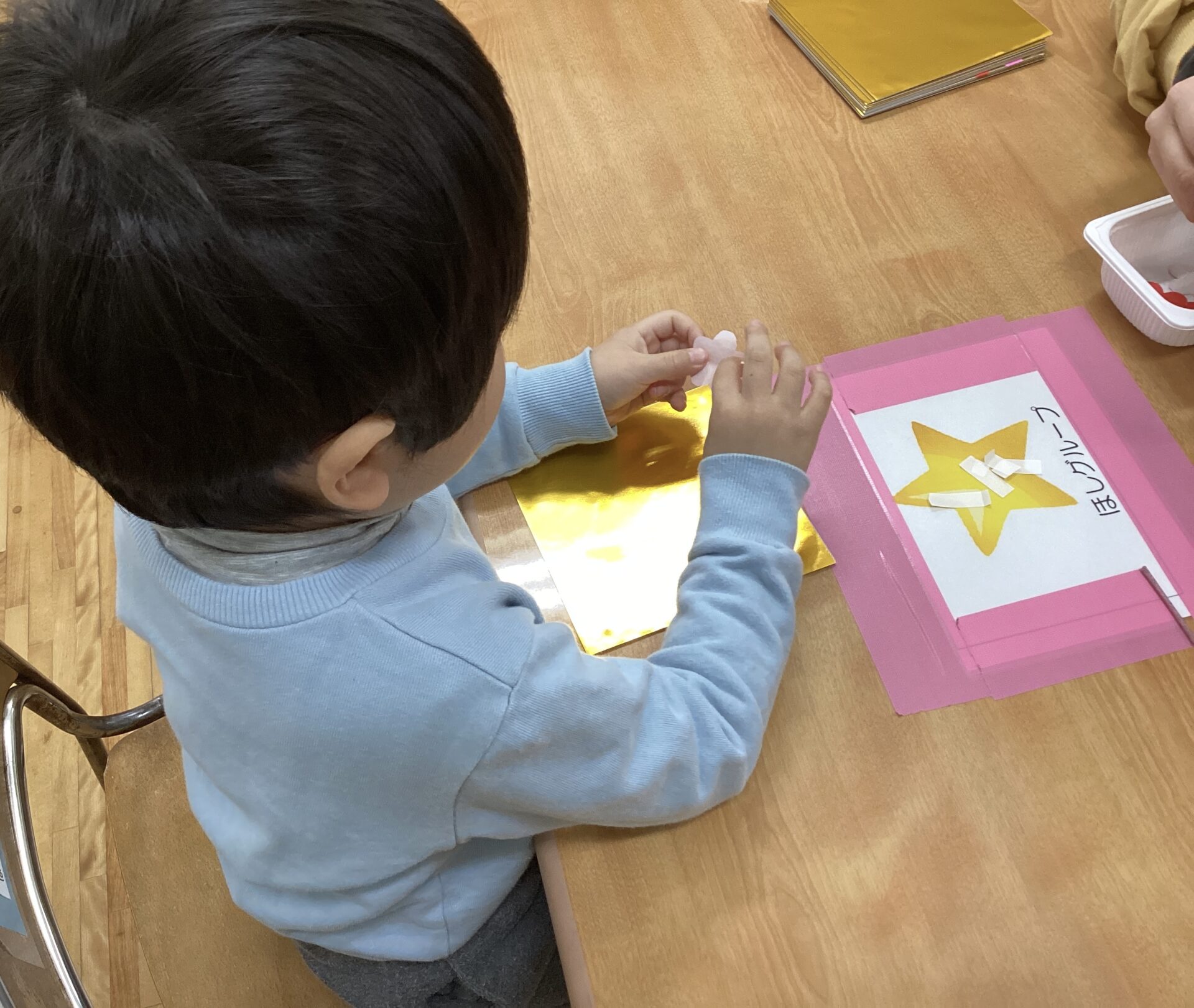 好きな折り紙をノリで貼り付けて、華やかになりました。