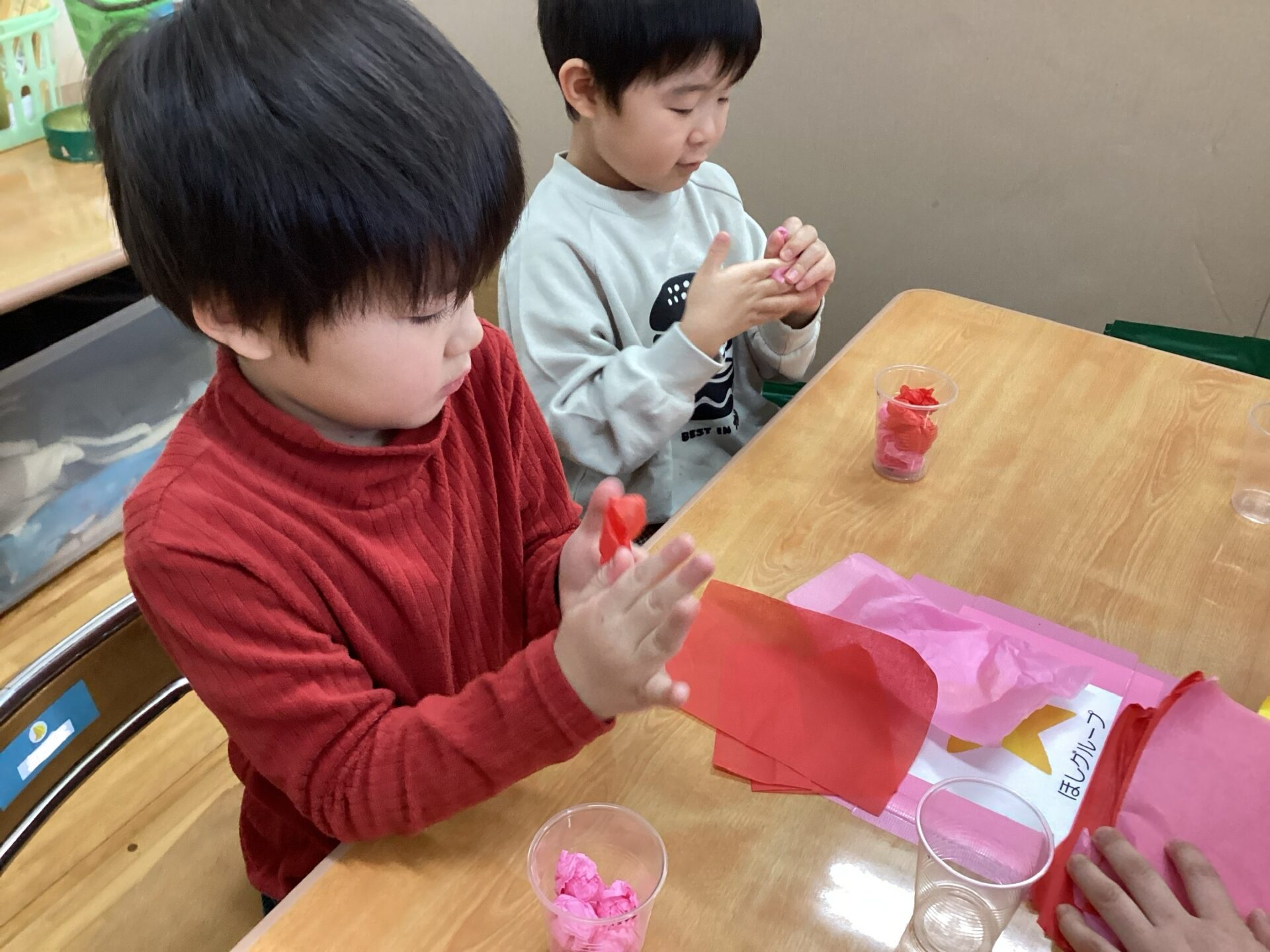紙コップに折り紙を貼ったり、プラコップにお花紙を入れたりして作りました。