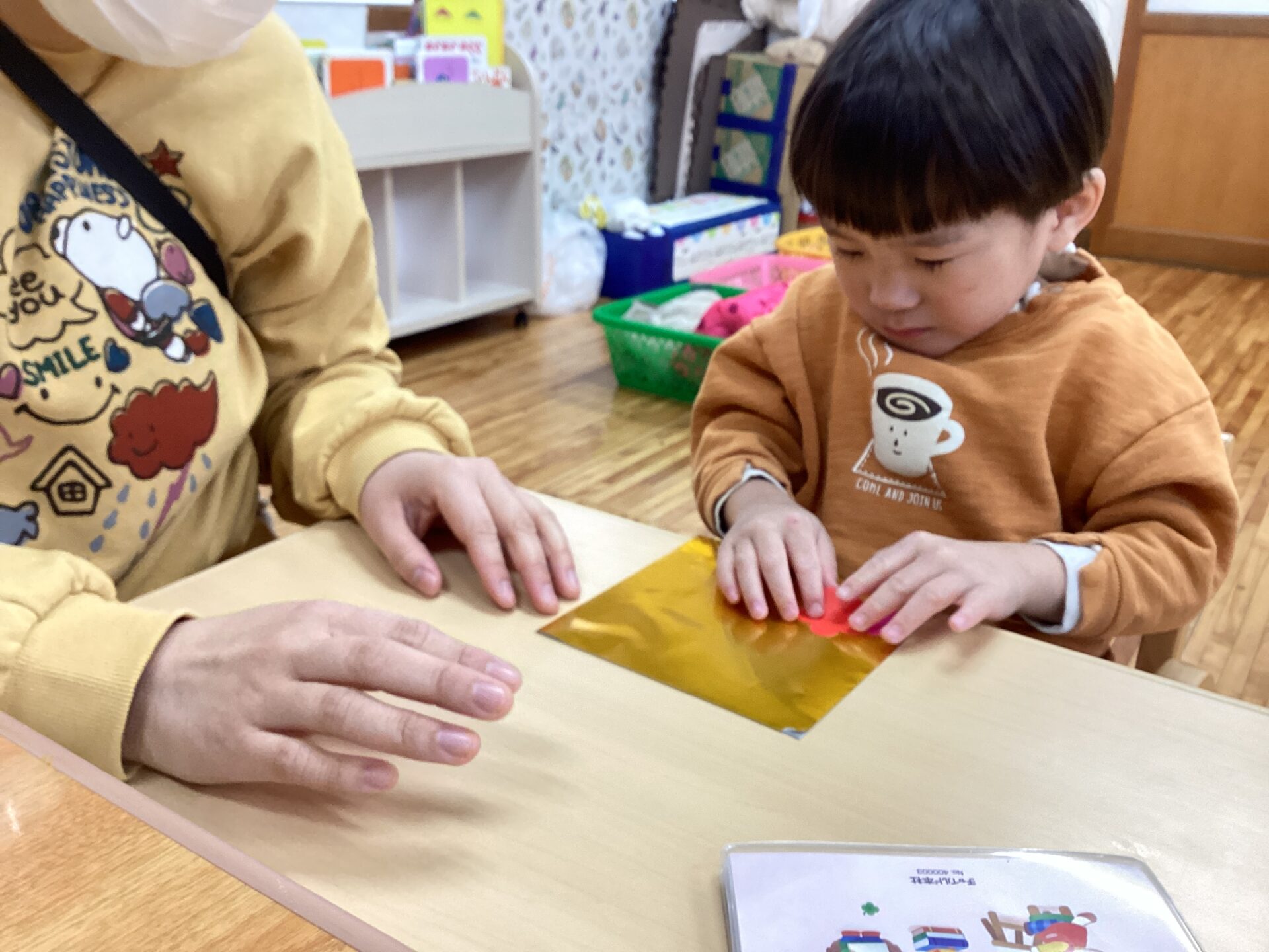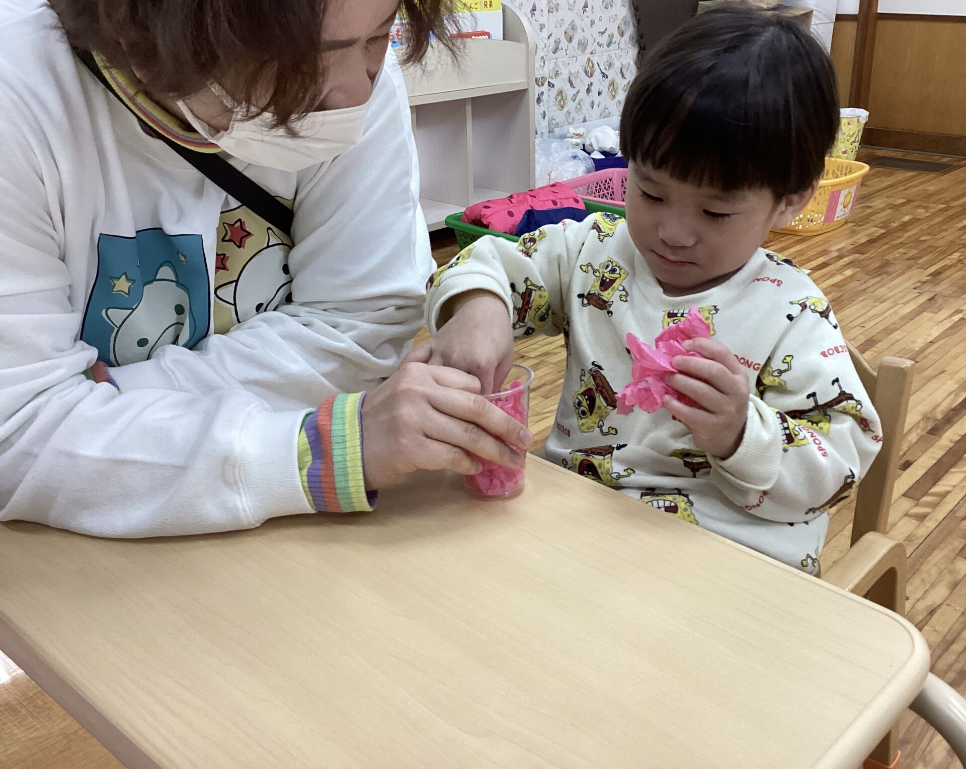 「ふわふわふわふわ〜」「ピンク!」など笑顔で取り組んでいました。