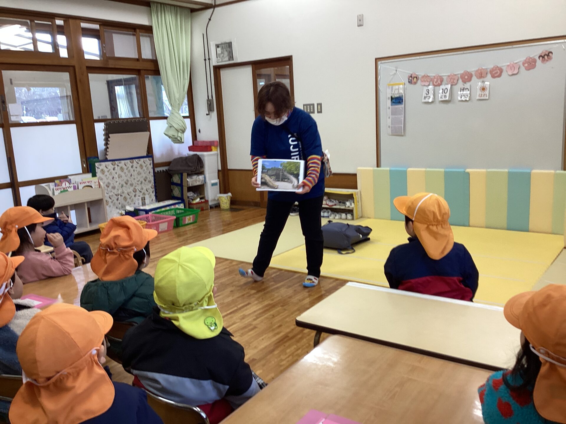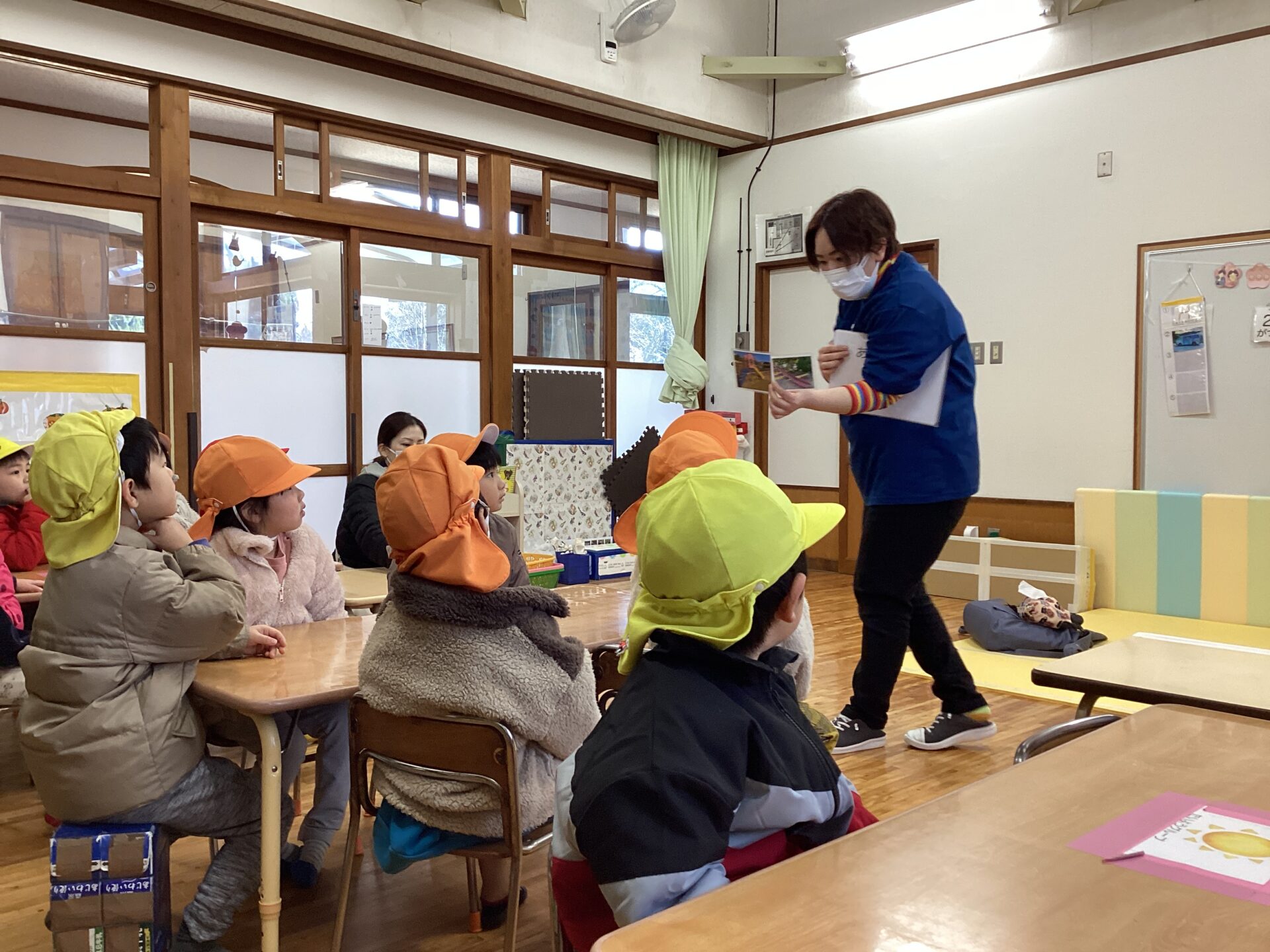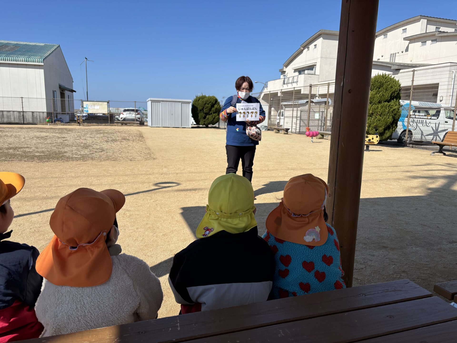 支度を済ませて、「さざなみ公園にいくよ」「じゅんばんばん 順番を守るよ」とお話を聞いているところです。